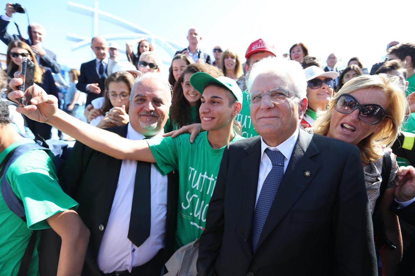 Nella foto: Sergio Mattarella mentre si fa un selfie con dei ragazzi della scuola e degli insegnanti