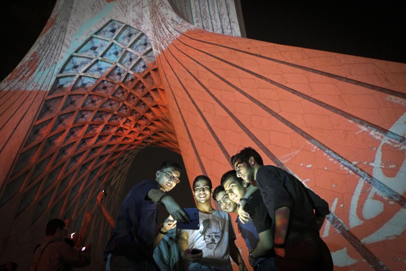 TEHRAN, Oct. 6, 2015 (Xinhua) — Iranian boys take a selfie as they stand beside the light installation on Azadi tower in Tehran, Iran, on Oct. 5, 2015. (Xinhua/Ahmad Halabisaz) (lrz)