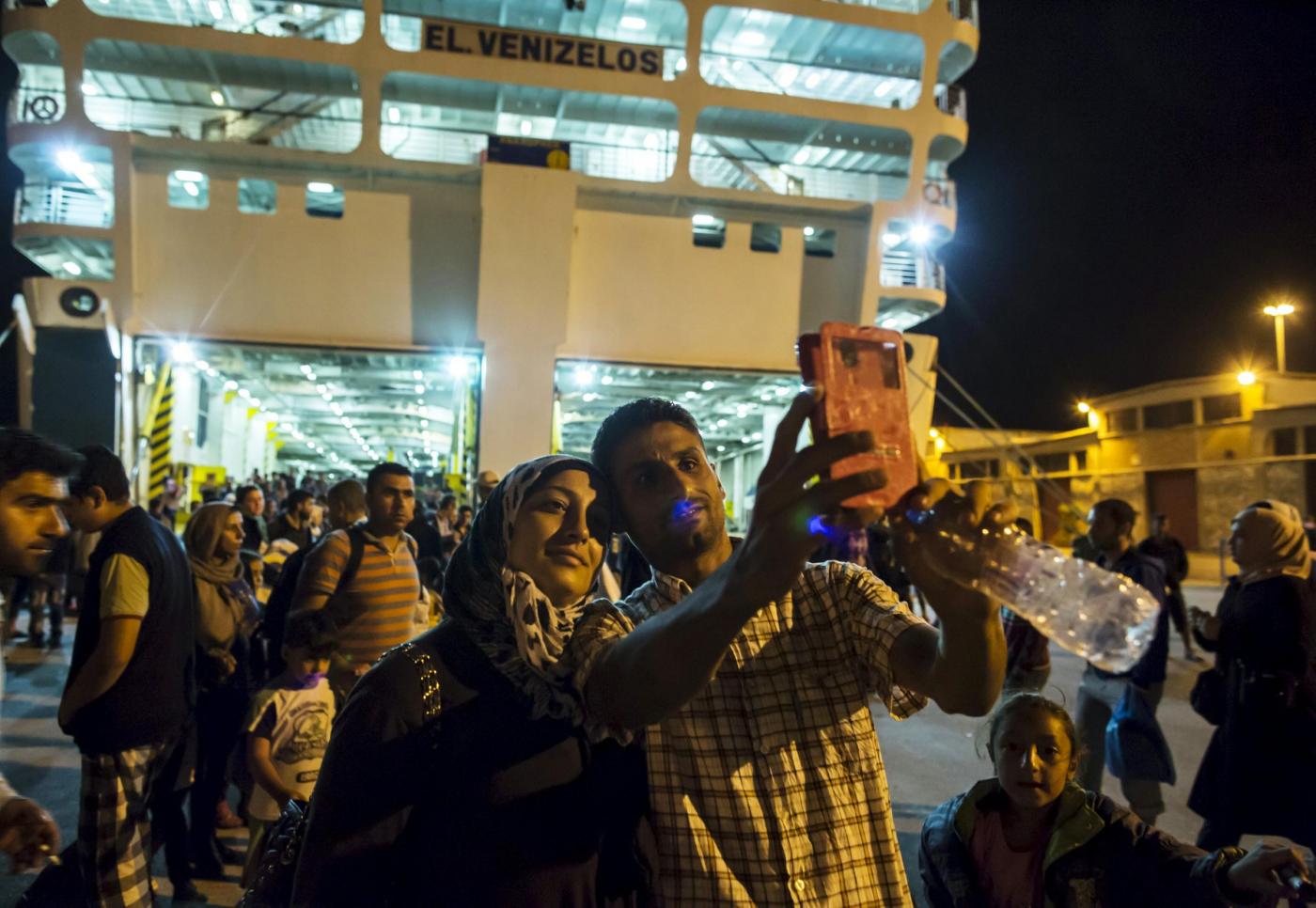Ihab, a 30-year old Syrian migrant from Deir Al Zour, war-torn Syria, takes a selfie with his wife Abeer after disembarking from a passenger ship in Athens, Greece September 12, 2015. The crossing from Turkey to Lesbos and the eventual trip to Athens is only the beginning for Ihab and other families. Ahead lies a trek north through Greece, up via Macedonia and Serbia to Hungary and on to Austria, Germany and more industrialised countries. Picture taken September 12, 2015. REUTERS/Zohra Bensemra