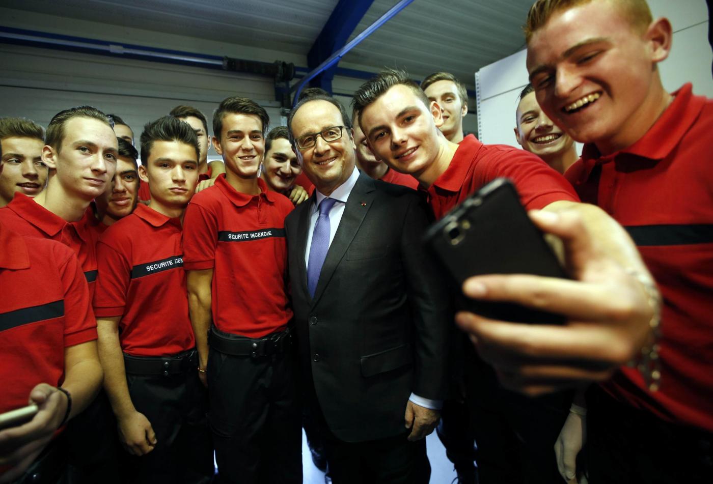 French President Francois Hollande (C) takes a selfie with students during a visit at the vocational high school "L’estaque" in Marseille, France, October 8, 2015. REUTERS/Jean-Paul Pelissier