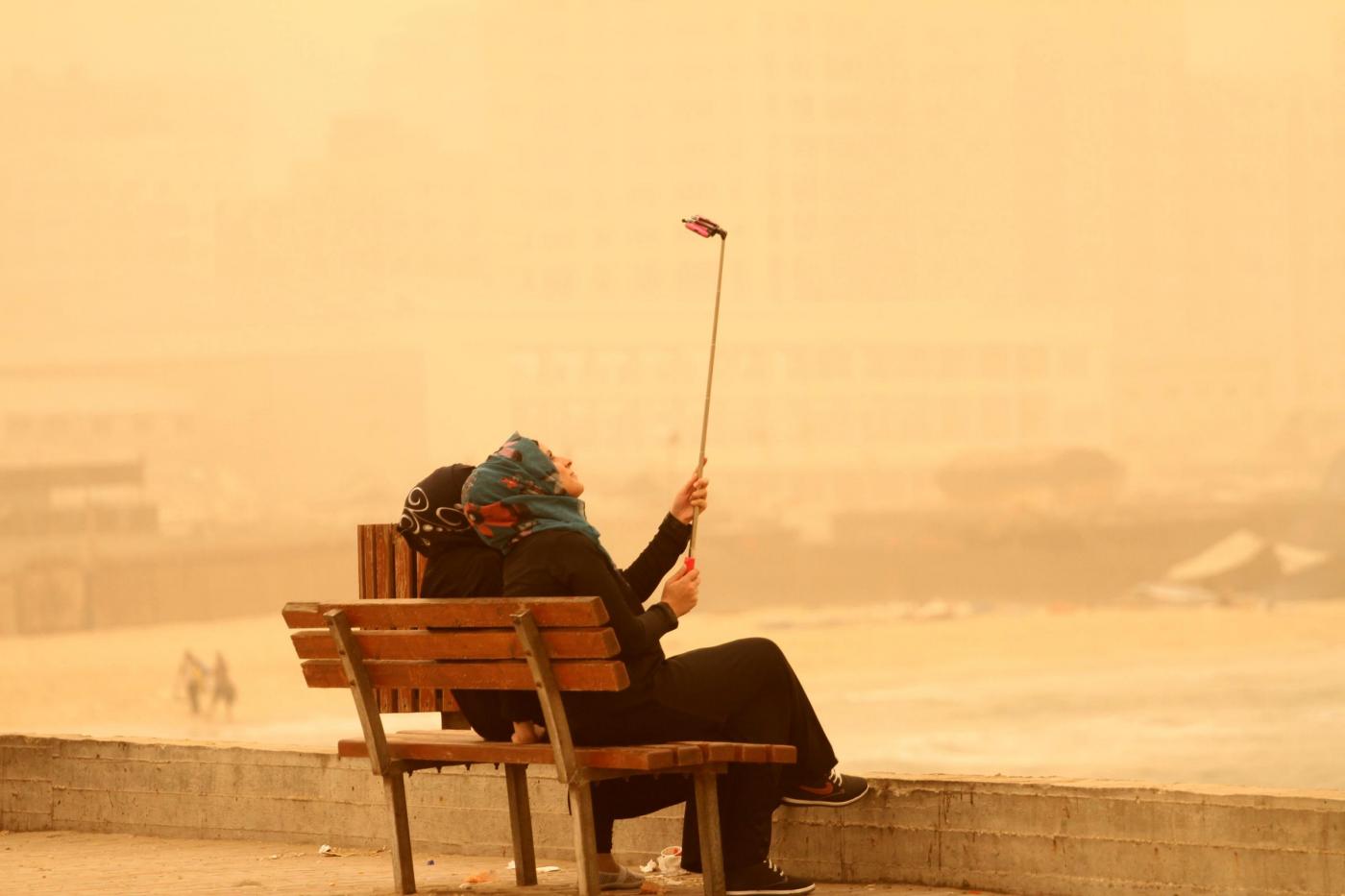 Sept. 8, 2015 – Gaza City, Gaza Strip, Palestinian Territory – Palestinian girls take a selfie as they sit off the coast of Gaza city during an unusual weather, September 8, 2015, affecting parts of Turkey, Cyprus, Syria, Lebanon, Palestine, Israel, Jordan, Iraq, UAE and Egypt, severely reducing visibility, killing at least 2 people and sending hundreds to hospitals. ZumaPressLaPresse — Only Italy