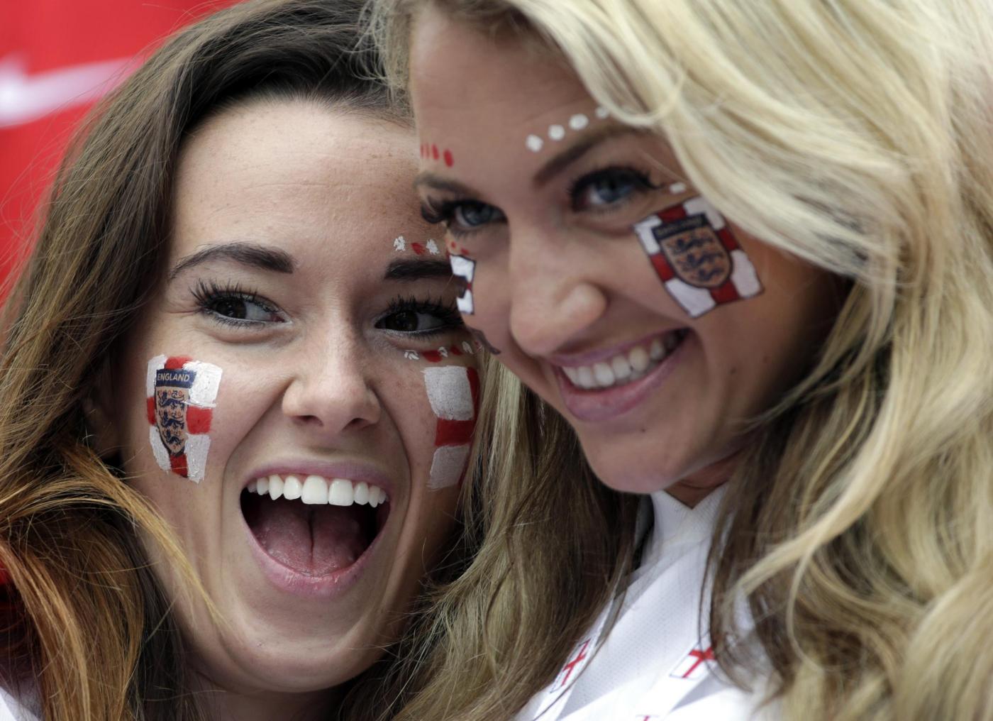 England fans pose for a ‘selfie’ before the group D World Cup soccer match between Uruguay and England at the Itaquerao Stadium in Sao Paulo, Brazil, Thursday, June 19, 2014. (AP Photo/Felipe Dana)