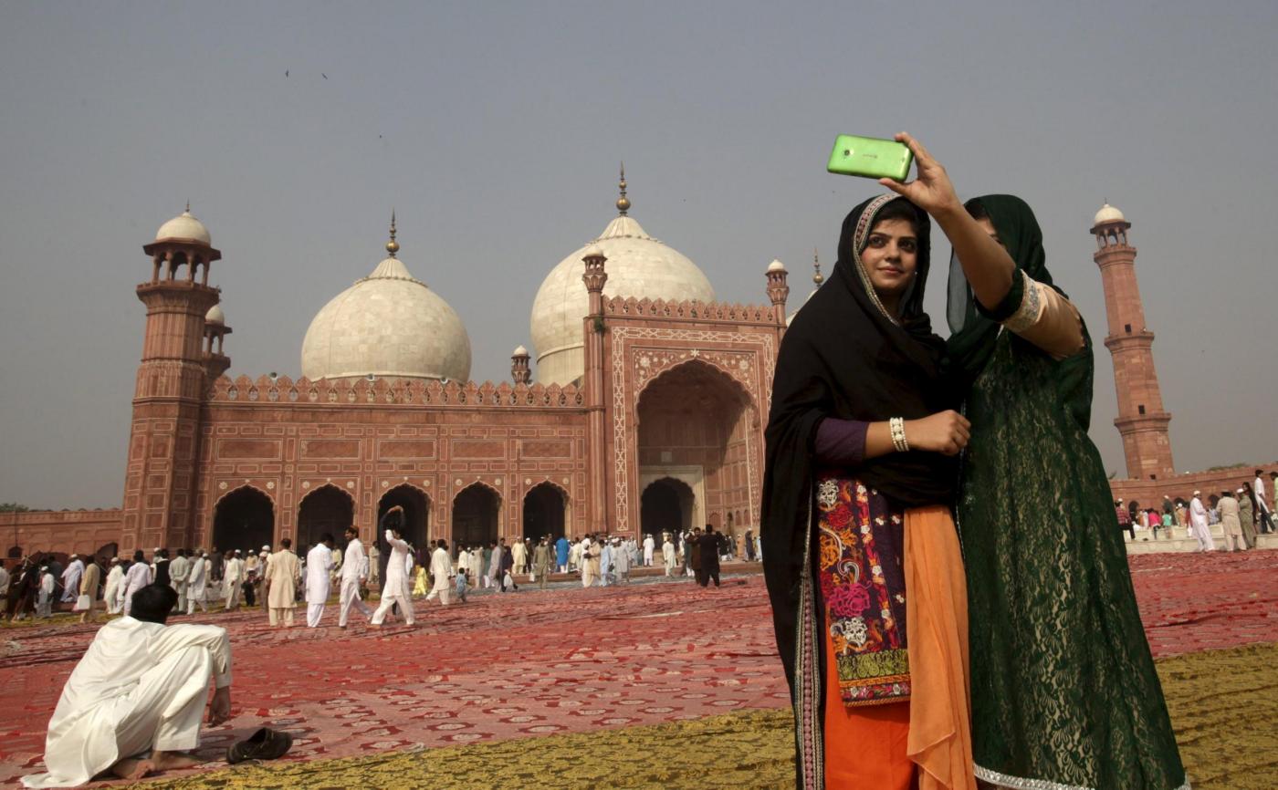Muslims take a selfie before a mass prayer for Eid al-Adha at the Badshahi mosque in Lahore, Pakistan September 25, 2015. Muslims across the world celebrate the annual festival of Eid al-Adha or the Festival of Sacrifice, which marks the end of the annual hajj pilgrimage, by slaughtering goats, sheep, cows and camels in commemoration of the Prophet Abraham’s readiness to sacrifice his son to show obedience to Allah. The meat should be distributed to the poor, neighbors and family. REUTERS/Mohsin Raza