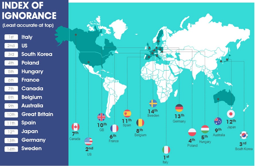 Alla fine Guardian tira le somme. Analizza 14 paesi e fa una classifica del livello medio di informazione. Come arriva l’Italia del panico credulone? Quattordicesima. E no, stavolta è un dato vero, non un’esagerazione.