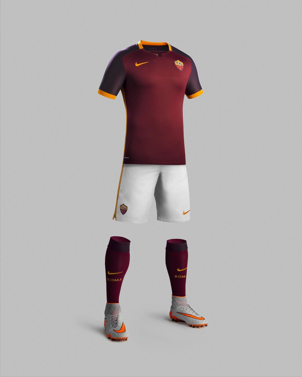 La prima maglia 2015 – 16 si presenta nel tradizionale colore rosso, con un nuovo girocollo caratterizzato da un intaglio frontale che si ispira alla scollatura della parte alta delle armature indossate dall’esercito romano più di 2000 anni fa. Una tonalità più scura di rosso corre poi lungo le spalle e caratterizza le maniche, i cui bordi, così come le strisce lungo i fianchi, sono nel tradizionale giallo del club. I pantaloncini sono bianchi con righe gialle su entrambi i lati, in continuità con quelle della maglia, mentre le calze abbinate alla prima divisa sono completamente rosse con una larga serie di galloni tono su tono sul retro del polpaccio.