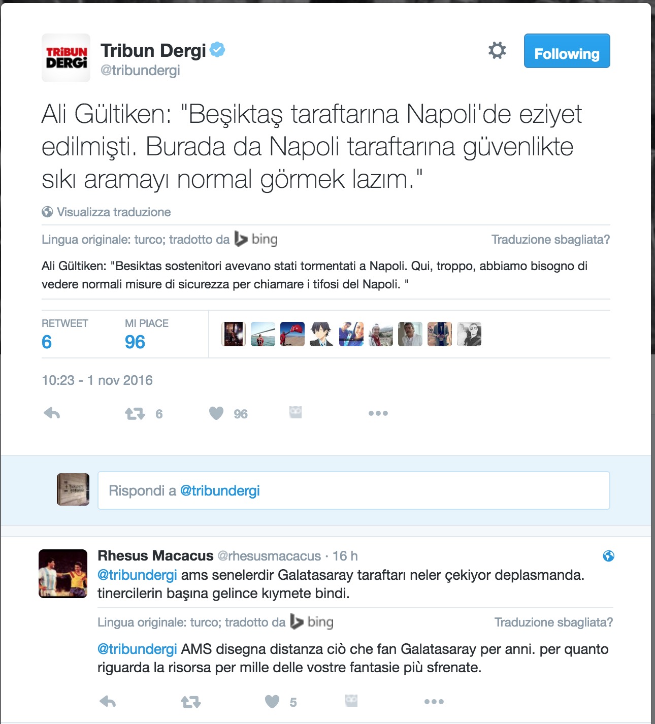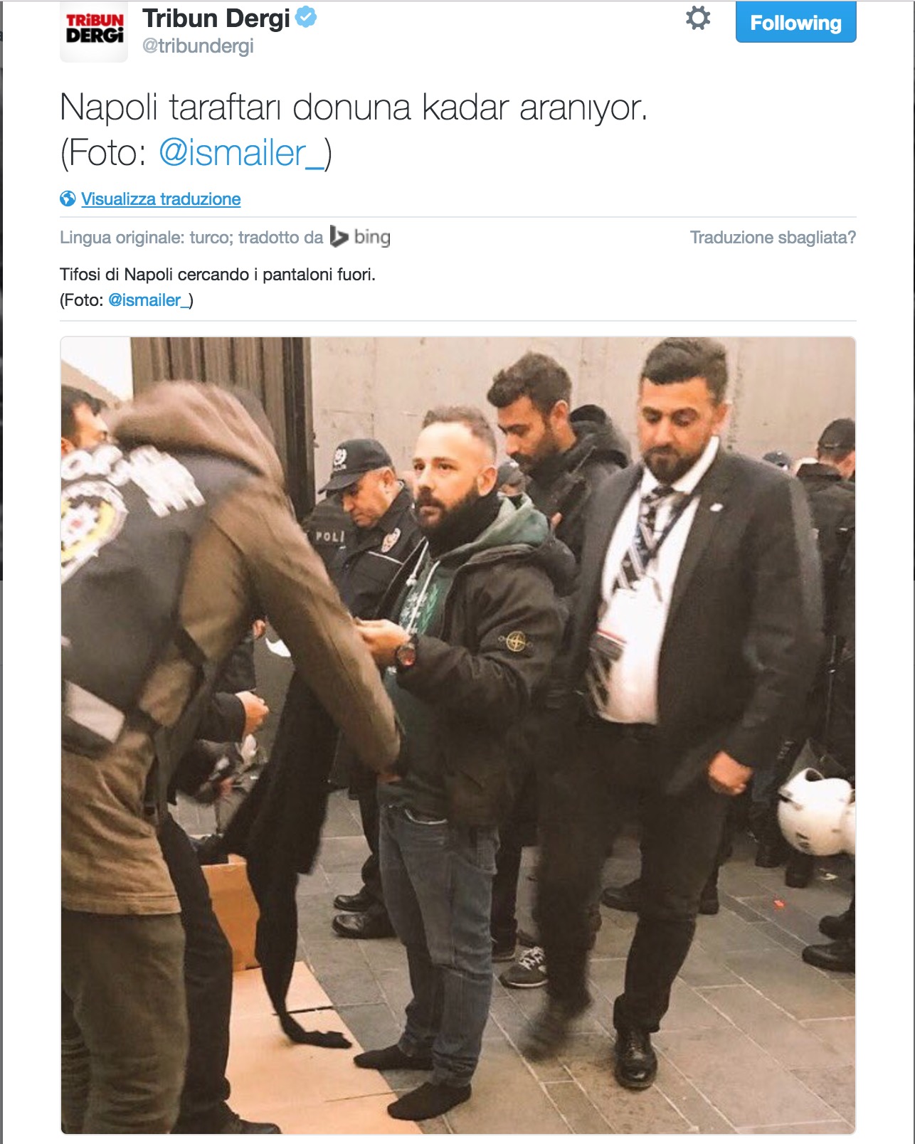 Per gli stessi testimoni citati da “Tribun Dergi”, la rissa sarebbe stata scatenata dal fatto che i napoletani erano senza biglietto e avrebbero voluto bypassare le forze di sicurezza, cosa inconcepibile nella Istanbul iper-militarizzata, nella città più importante della Turchia di Erdogan, che solo negli ultimi giorni ha epurato altri 10 mila dipendenti pubblici e ha autorizzato un blitz della polizia contro uno degli ultimi giornali di opposizione, Cumhuriyet.