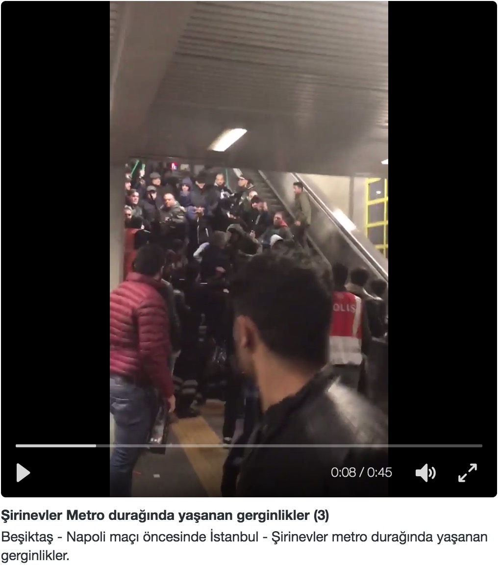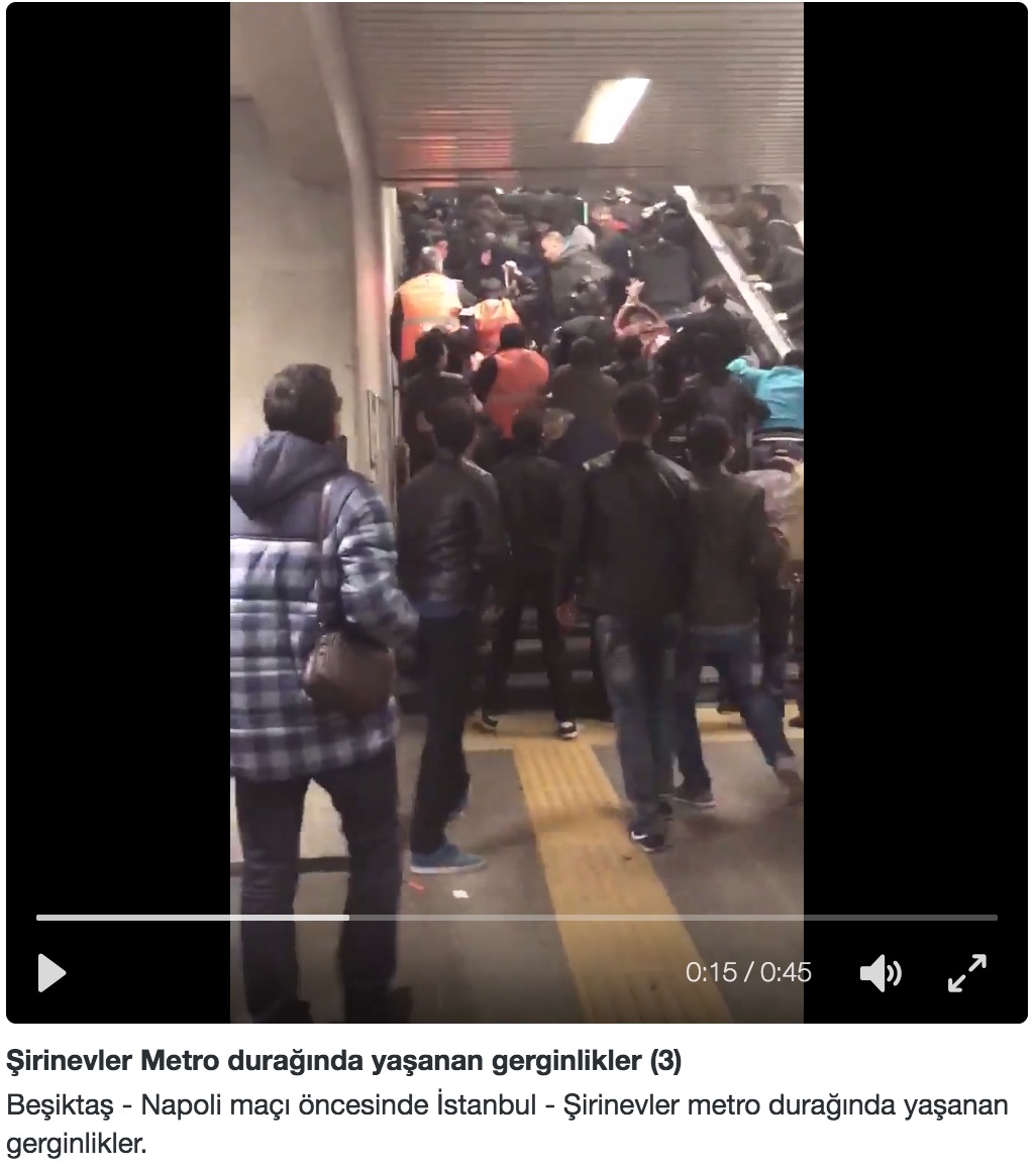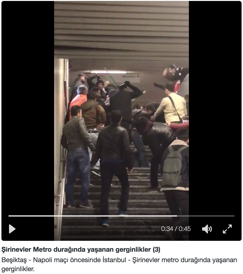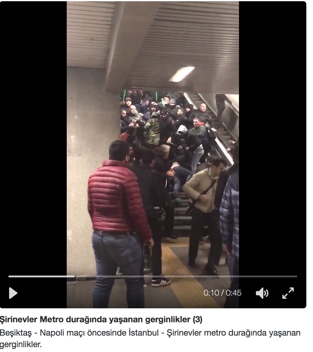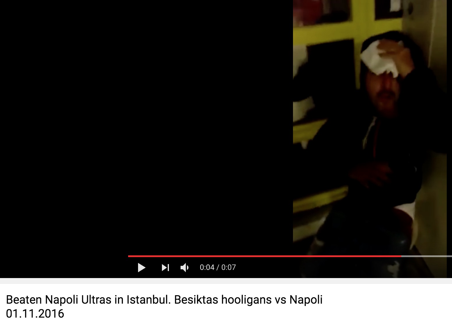 Nessuno di questi indossa i colori bianconeri del Besiktas o è riconoscibile come tifoso del Besiktas. Si vedono invece pettorine arancioni e divise della polizia. Il gruppo in basso riesce improvvisamente a scatenare la fuga nelle scale dei napoletani, i quali, fatto qualche gradino, si fermano e riprendono a randellare con le aste delle bandiere. Al termine della rissa si intravede una persona per terra, dolorante. Secondo foto e video successivi, sarebbe un tifoso del Napoli, rimasto in qualche modo ferito.