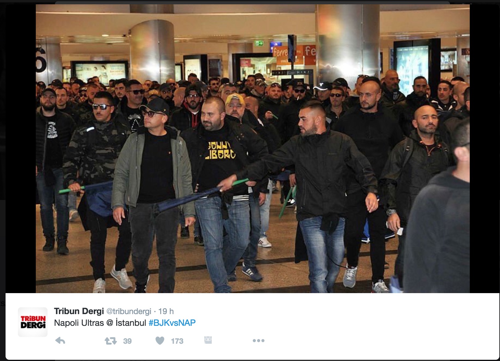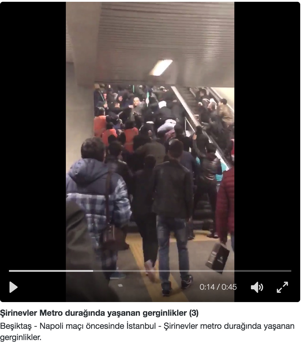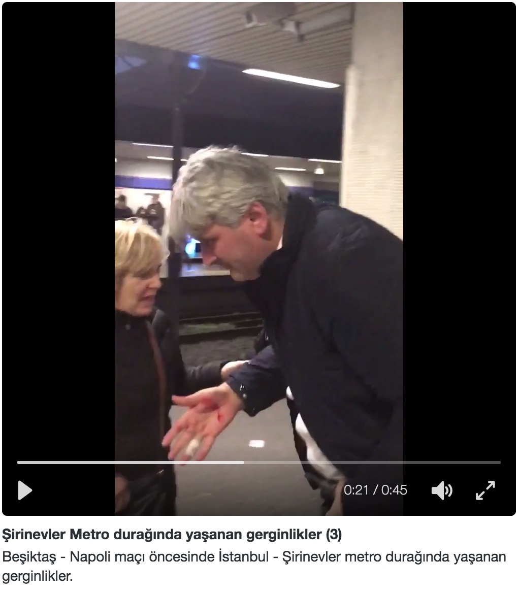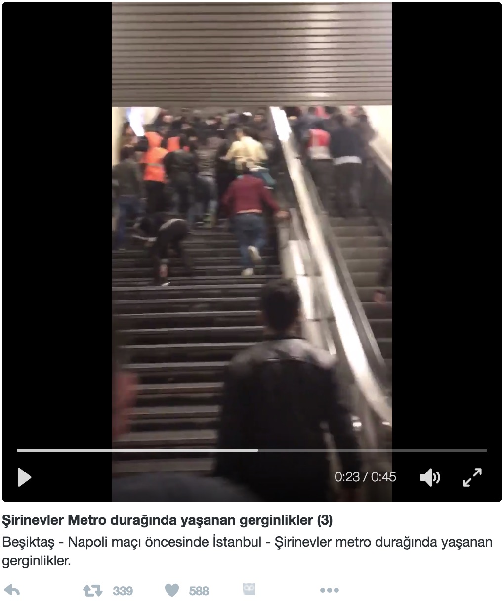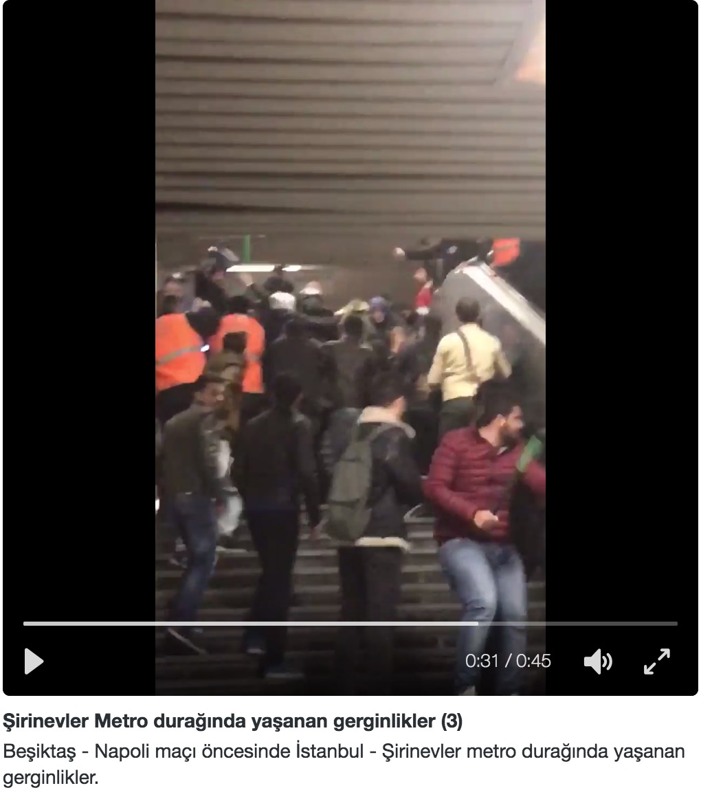 Nessuno di questi indossa i colori bianconeri del Besiktas o è riconoscibile come tifoso del Besiktas. Si vedono invece pettorine arancioni e divise della polizia. Il gruppo in basso riesce improvvisamente a scatenare la fuga nelle scale dei napoletani, i quali, fatto qualche gradino, si fermano e riprendono a randellare con le aste delle bandiere. Al termine della rissa si intravede una persona per terra, dolorante. Secondo foto e video successivi, sarebbe un tifoso del Napoli, rimasto in qualche modo ferito.