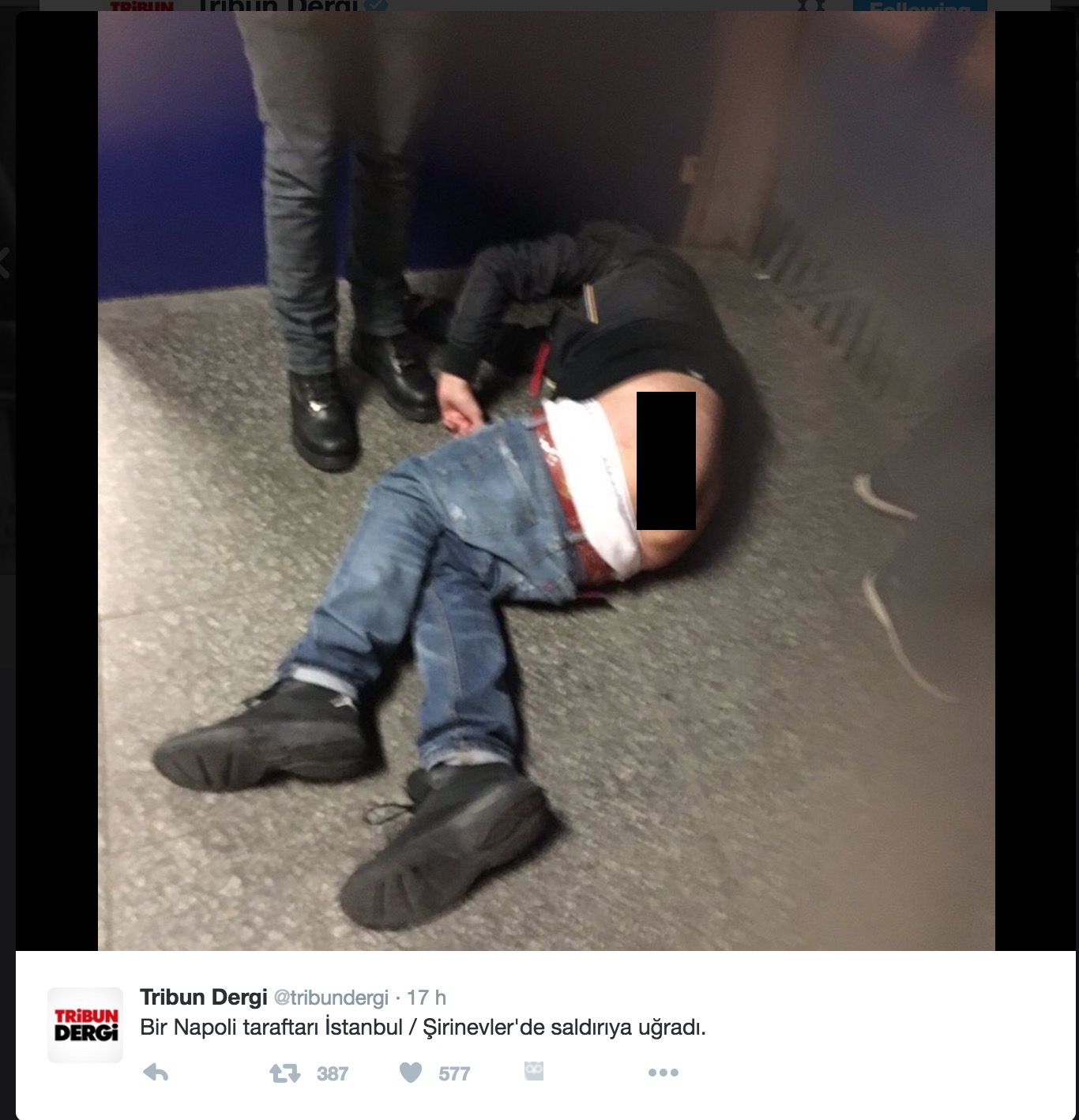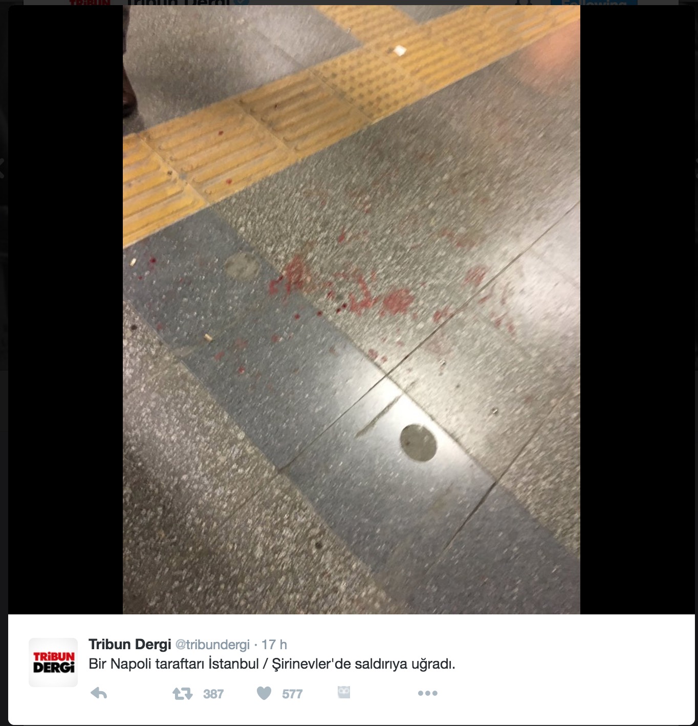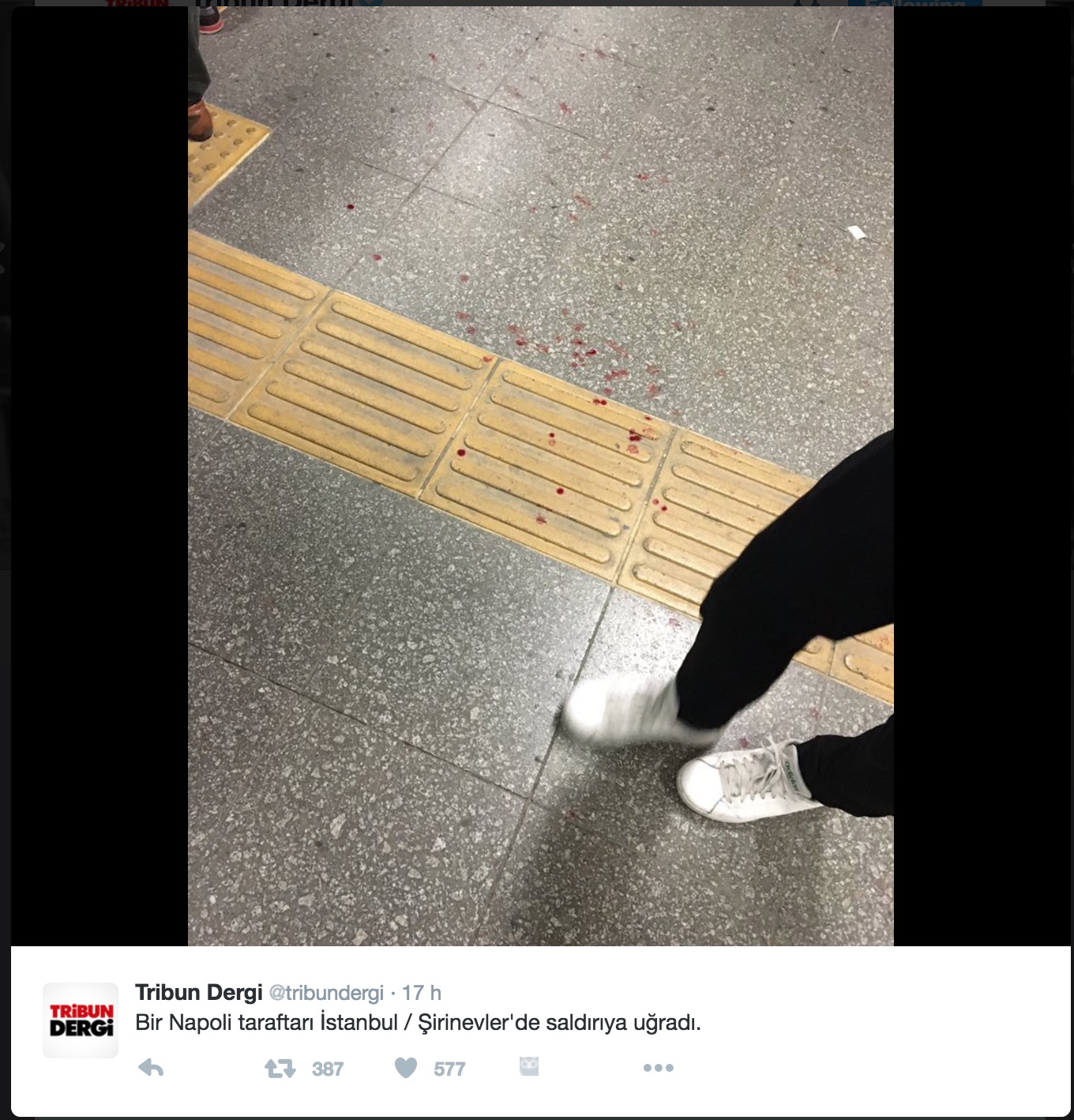 In alcune foto si vede un napoletano con i pantaloni abbassati, ma non si vede traccia di una coltellata: i pantaloni potrebbero essere stati tirati giù da uno che nella rissa era più in basso e vi si è aggrappato. In altre si vedono macchie di sangue sul pavimento della metro di Şirinevler. Sono macchie, non pozze: più compatibili con la rottura di un setto nasale, di uno zigomo o di un sopracciglio, che con una ferita da arma da taglio. “Tribun Dergi” riporta la versione di testimoni secondo i quali il sangue sarebbe di un poliziotto/uomo della security.