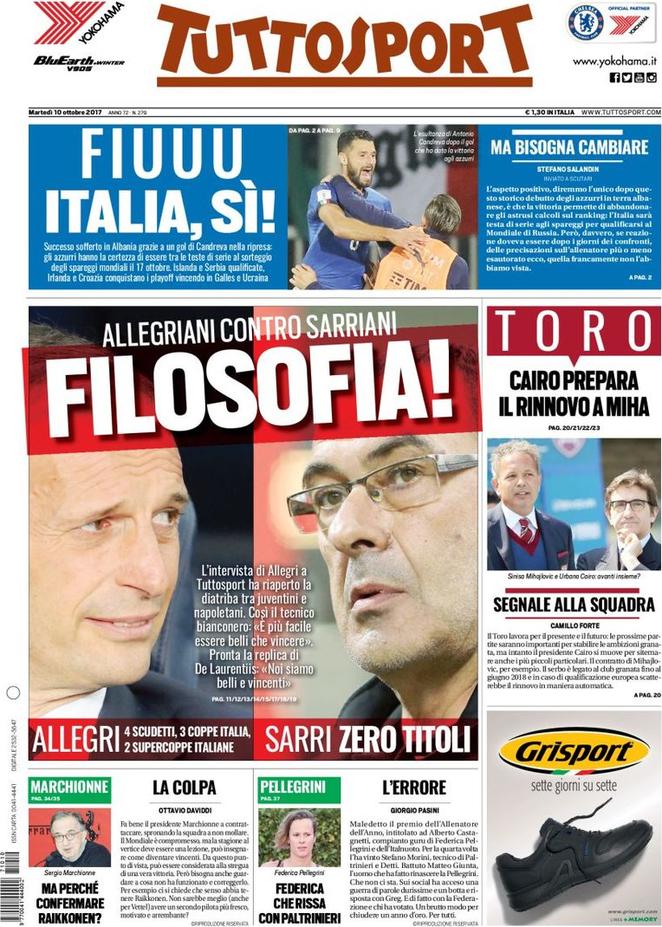 Spazio alle analisi fra Juventus e Napoli su Tuttosport in vista del confronto del primo dicembre. La seconda e prima squadra in classifica si stanno contendendo il titolo di questa stagione già da adesso e ieri il tecnico Allegri ha rilasciato parole di fuoco. “E’ più facile essere belli che vincere”, aveva il tecnico juventino alludendo che al gioco del Napoli. Bello ma spesso poco incisivo. Anche la scorsa stagione i bianconeri non sempre avevano brillato nel gioco, ma hanno vinto lo scudetto e raggiunto la finale di Champions League. Sulla prima pagina c’è una foto di Allegri e Sarri e sotto i titoli vinti: 9 per lo juventino contro gli 0 del napoletano. All’intervista di Max Allegri oggi ha replicato il presidente del Napoli, De Laurentiis che ha dichiarato che la sua squadra è bella e vincente.