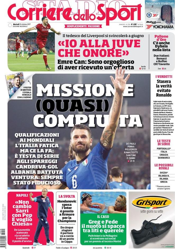 ROMA – Tutte le principali news sul calcio sui giornali italiani di oggi, martedì 10 ottobre. Ieri l’Italia ha battuto per 1-0 l’Albania di Christian Panucci nella gara di qualificazioni per i Mondiali del 2018 e la Gazzetta dello Sport apre con questa notizia. Il match ha visto gli azzurri sottotono, tanto che è servito un gol di Antonio Candreva al ventottesimo del secondo tempo per registrare il vantaggio. Con questo risultato la Nazionale va ai playoff, dove arriva come prima della fascia per questo la Gazzetta ha titolato “Testina di serie”. Giampiero Ventura ancora non convince del tutto e invita i club a far giocare i giocatori italiani per essere pronti nelle sfide delle nazionali. Agli spareggi l’Italia eviterà la Croazia, e una fra Portogallo e Svizzera.