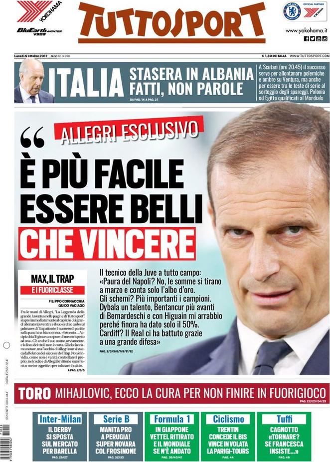 In questo inizio di campionato e Champions League la Juventus ha visto un andamento a luci e ombre e l’allenatore Massimiliano Allegri ne parla a Tuttosport. “Paura del Napoli? No, le somme si tirano a marzo e conta solo l’albo d’oro”, dice. Il match fra le due squadre si giocherà il prossimo primo dicembre, quando i giocatori di entrambi i club avranno sulle spalle diverse partite di serie A e Champions e servirà quindi lucidità e condizione. Allegri si sofferma anche sui membri della sua rosa, spiegando che Dybala è un talento e Bentancur è più avanti di Bernardeschi. “Con Higuain – continua- mi arrabbio perché finora ha dato il 50%”.