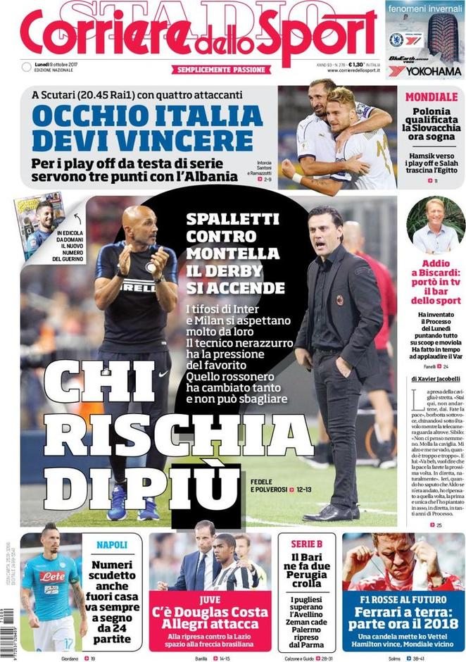 Cresce l’attesa per il derby fra le milanesi Inter e Milan di cui il Corriere dello Sport ricorda in prima pagina. I due club vengono da una stagione travagliata: posizioni in classifica dopo il quarto posto; sconfitte brucianti; umore a terra. L’Inter ha deciso di puntare su Luciano Spalletti che attualmente ha portato i nerazzurri al terzo posto, una buona posizione per tornare in Champions. Diversa la situazione di Vincenzo Montella che, dopo la sconfitta finita 0-2 contro la sua Roma, con il Milan si trova al settimo posto. I tifosi rossoneri si aspettano di più dalla propria squadra, mentre quelli nerazzurri vorrebbero consolidare l’attuale posizionamento.