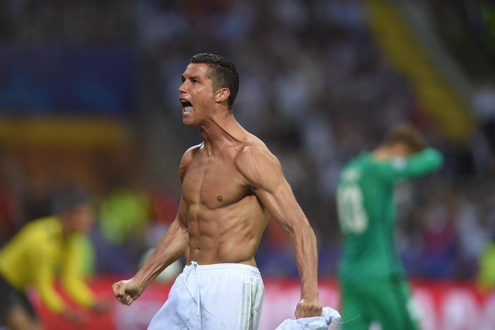 Real Madrid’s Cristiano Ronaldo celebrates after scoring the decisive penalty kick during the Champions League final soccer match between Real Madrid and Atletico Madrid at the San Siro stadium in Milan, Italy, Saturday, May 28, 2016. Real Madrid won 5-4 on penalties after the match ended 1-1 after extra time. (ANSA/AP Photo/Alessandra Tarantino)