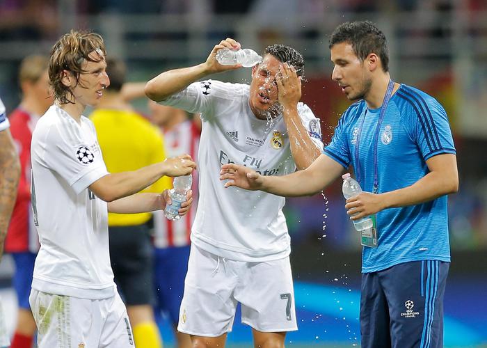 Real Madrid’s Cristiano Ronaldo and Luka Modric, left, take on water before extra time during the Champions League final soccer match between Real Madrid and Atletico Madrid at the San Siro stadium in Milan, Italy, Saturday, May 28, 2016. (ANSA/AP Photo/Manu Fernandez)