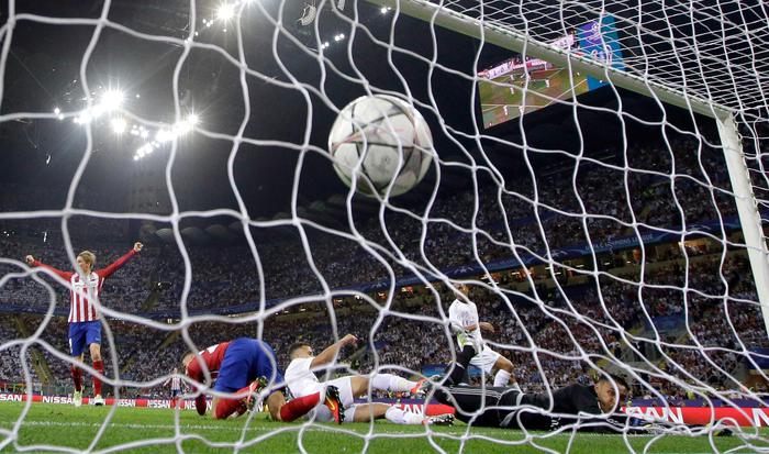 epa05334563 Real Madrid’s Sergio Ramos (C) scores the 1-0 lead during the UEFA Champions League final between Real Madrid and Atletico Madrid at the Giuseppe Meazza Stadium in Milan, Italy, 28 May 2016. EPA/CHRISTIAN BRUNA