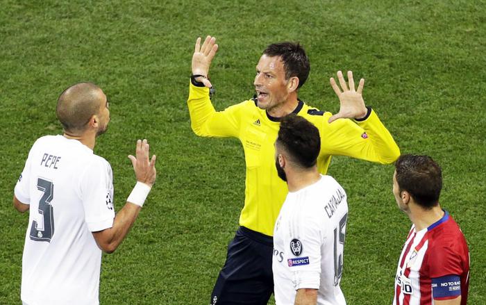 epa05334640 Real Madrid’s Pepe (L) argues with English referee Mark Clattenburg (C) during the UEFA Champions League final between Real Madrid and Atletico Madrid at the Giuseppe Meazza Stadium in Milan, Italy, 28 May 2016. EPA/ARMANDO BABANI