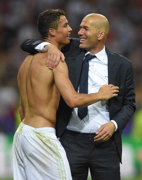 epa05334879 Real’s Cristiano Ronaldo (L) celebrates with his coach Zinedine Zidane after winning the penalty shootout of the UEFA Champions League Final between Real Madrid and Atletico Madrid at the Giuseppe Meazza stadium in Milan, Italy, 28 May 2016. EPA/PETER POWELL