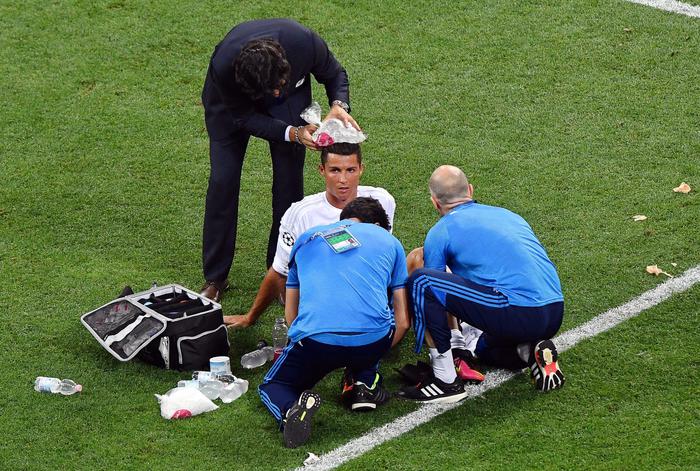 epa05334804 Real Madrid’s Cristiano Ronaldo (C) rests before the extra time of the UEFA Champions League final between Real Madrid and Atletico Madrid at the Giuseppe Meazza Stadium in Milan, Italy, 28 May 2016. EPA/CHRISTIAN BRUNA