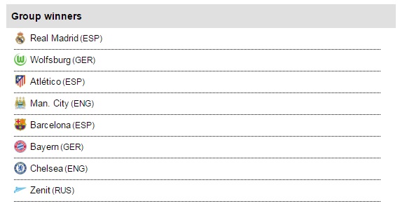 Teste di serie: Atletico Madrid (SPA), Bayern Monaco (GER), Barcellona (SPA), Chelsea (ING), Manchester City (ING), Real Madrid (SPA), Wolfsburg (GER) e Zenit (RUS).