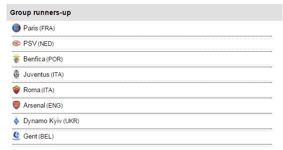 Non teste di serie: Arsenal (ING), Benfica (POR), Dinamo Kiev (UCR), Juventus (ITA), Paris Saint Germain (FRA), Psv Eindhoven (OLA), Roma (ITA) e Gent (BEL).