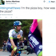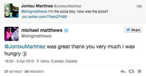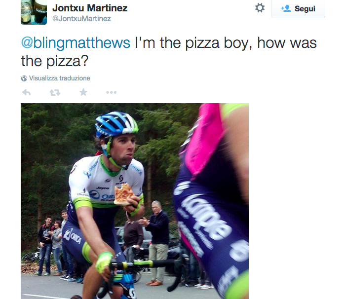 Come va Michael Matthews al Giro dei Paesi Baschi? Dal punto di vista del risultato dopo il primo e il secondo posto delle prime due tappe, nella generale, al termine della quarta frazione, è al 75esimo posto a 31’12” dal leader Sergio Henao. Ma il 24enne australiano non si è certo depresso. Anzi, in corsa si è concesso un fuori programma che piace molto sui social network. Uno spicchio di pizza margherita addentato in piena salita, offerto da uno spettatore. Non esattamente un cibo molto diffuso in corsa. Anzi, in un servizio di Global Cycling Network dello scorso anno, tra i 10 cibi sconsigliati mentre si pedale c’è proprio la pizza per ragioni pratiche: “Semplicemente non è disegnata per essere mangiata pedalando”, spiegavano. L’episodio ha alimentato un divertente dialogo a base di cinguetii su Twitter con un’utente che si è qualificato come il “pizza-boy” e ha chiesto come era la pizza. E Matthews che ha ringraziato.