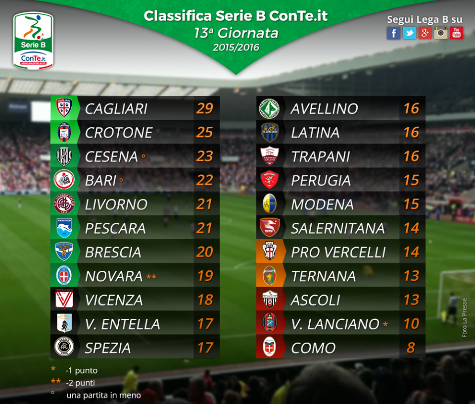 Classifica del campionato di calcio di Serie B, dopo le partite della 13/a giornata.