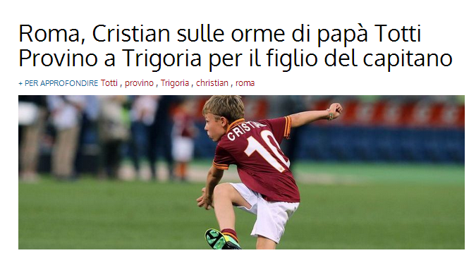 ROMA – Di padre in figlio. Cristian Totti, figlio della bandiera della Roma Francesco Totti, ha trascinato la baby Roma alla vittoria a suon di gol. Nel torneo di calcio a cinque per bambini di San Felice Circeo, il piccolo Cristian Totti ha portato alla vittoria la sua squadra con la maglia numero 10 sulle spalle e la fascia da capitano al braccio.