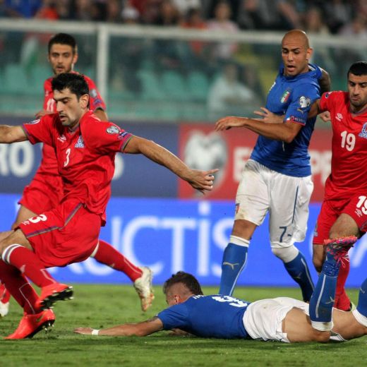 Dopo una bella girata in area di Immobile, murato da Guseynov, è Ranocchia ad andare più vicino di tutti al gol: minuto 37′, punizione di Pirlo e girata di testa un soffio sopra la traversa. E’ l’anticipo del gol, a un minuto dallo scadere, ma su angolo del regista schiacciato a rete da Chiellini. In mezzo, c’era stata la richiesta di un rigore di Bonucci per un mani involontario di Guseynov, e un’ammonizione giusta a Pirlo. Scossa dal gol, l’Italia riparte nel secondo tempo con altra voglia.