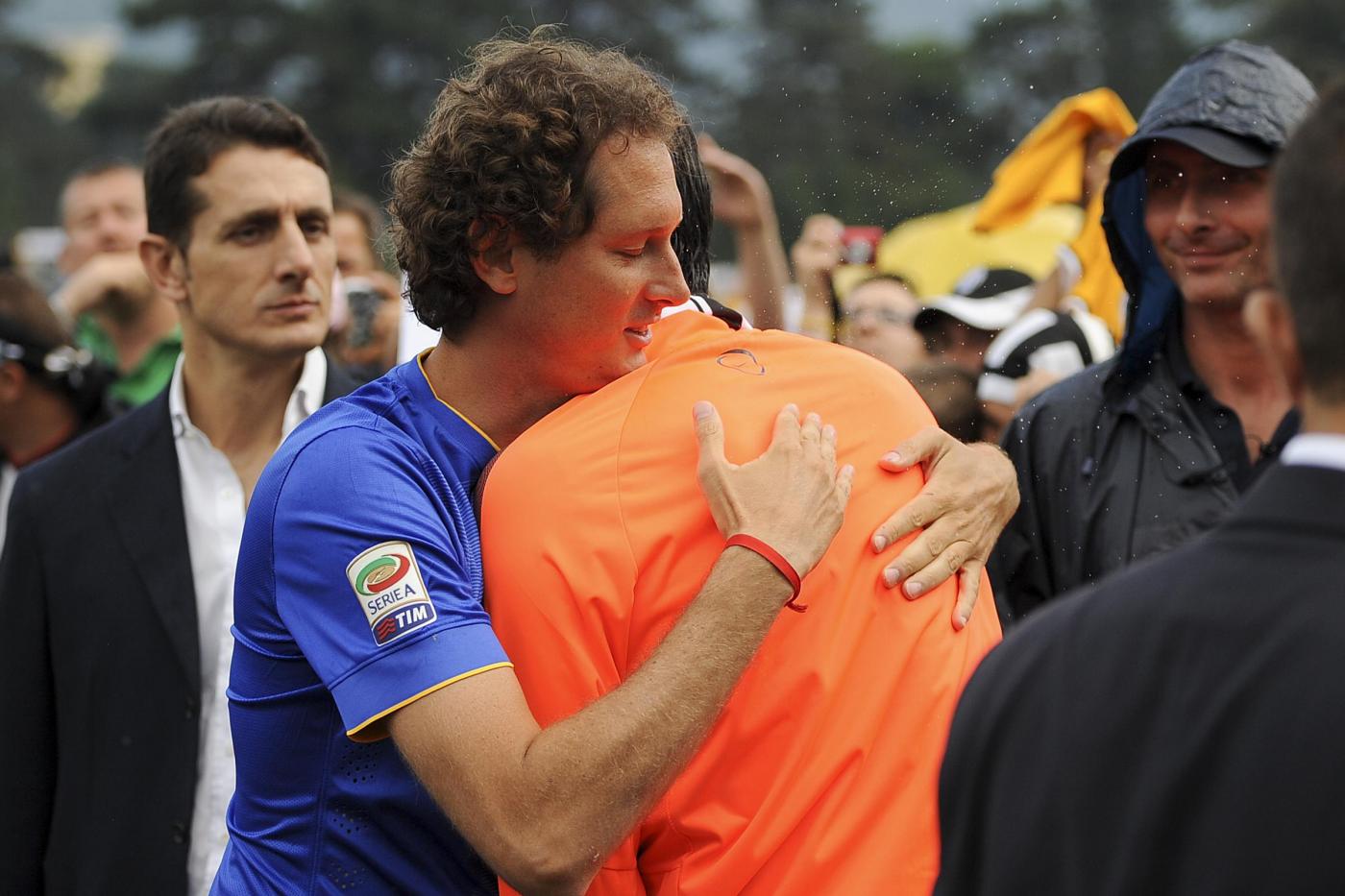 Il nervosismo sale, vola qualche colpo proibito, ci sono lamentele da una parte e dall’altra. I fuochi d’artificio cominciano al 26′: punizione di Pirlo, Maicon nella barriera qualche centimetro dentro l’area, salta, il pallone schizza sul gomito. Né il fallo di mano né la posizione dentro l’area del pallone sono chiari e indiscutibili. Rocchi propende per la punizione. Cambia idea dopo che, su richiesta di Marchisio, si consulta con il guardalinee. Rigore, tra le proteste dei gialorossi.