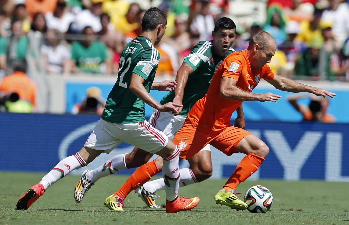 Al 17′ combinazione Peralta-Guardado-Herrera con tiro di poco fuori, al 23′ Salcido costringe in angolo Cillessen. Dopo il cooling break la migliore occasione messicana al 42′: tacco di Peralta, da Guardado a Giovanni per la respinta del portiere. Un errore di Marquez al 48′ lancia Van Persie che serve Robben su cui rinvengono Marquez e Moreno, che si infortuna e esce rischiando il rigore. Ma l’assetto difensivo oranje scricchiola.