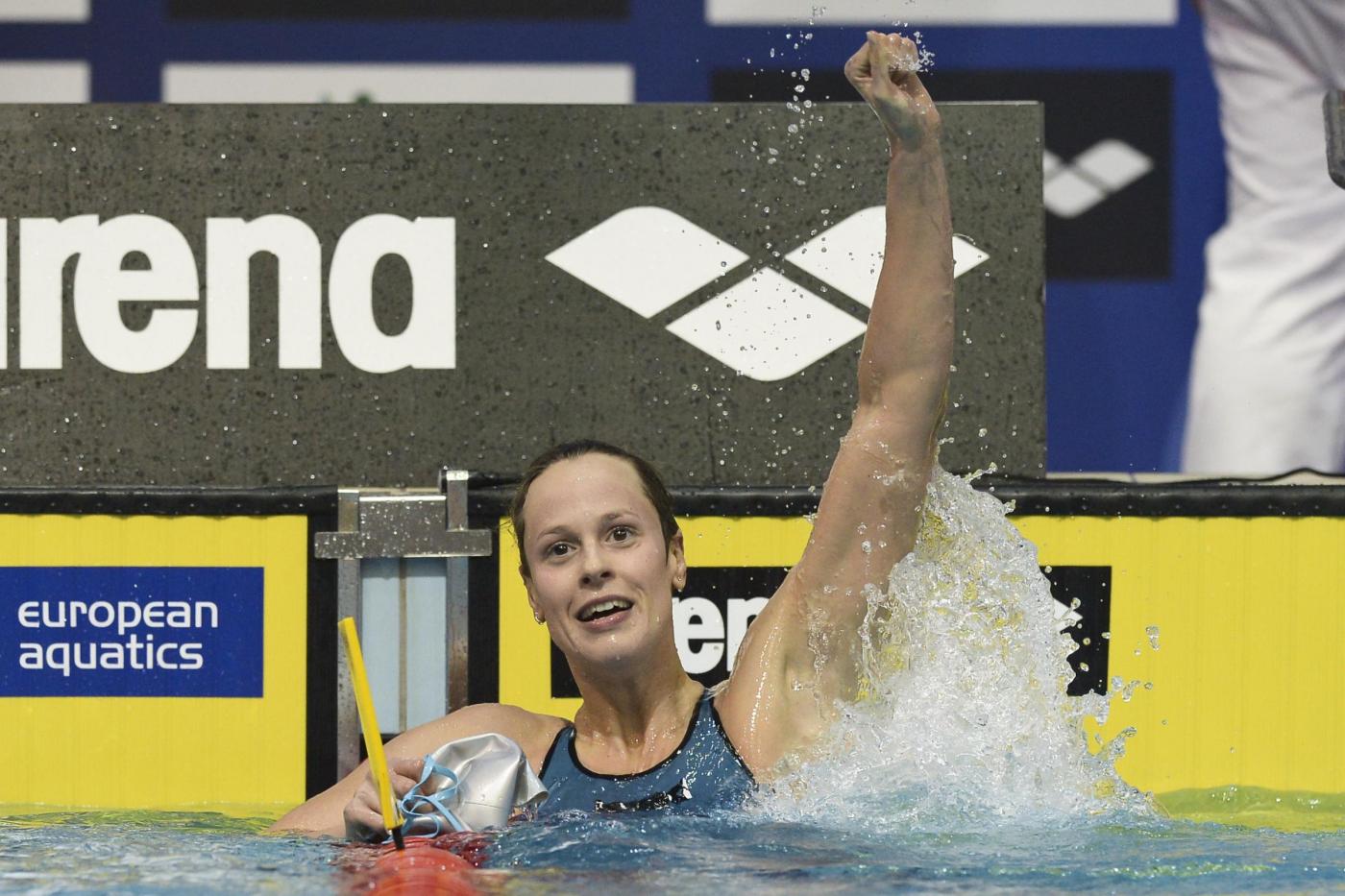 Federica Pellegrini non nasconde la gioia dopo aver centrato la quinta vittoria europea nei 200 stile.
