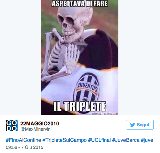 ROMA – Serata di delusione e lacrime per i tifosi della Juventus e di gioia e sfottò per gli “anti- juventini” d’Italia. La Juventus ha fallito il Triplete: dopo la Coppa Italia e lo scudetto non è arrivata la Champions League. Triplete invece festeggiato dal Barcellona di Luis Enrique. Eppure c’è anche un’Italia che ha festeggiato. Mentre i tifosi della Juventus vedevano infrangersi il sogno Triplete, la vittoria del Barcellona ha fatto felice un bel po’ di anti juventini e di tifosi di altre squadre del campionato italiano. L’Italia si è dimostrata spaccata in due: tifosi della Juventus ed anti juventini. Questo accade quando le rivalità sono molto forti, a maggior ragione se a giocarsi la Champions era quella Juventus che alle rivali ha lasciato solo le briciole nelle ultime quattro stagioni di campionato. Ecco le foto con alcuni sfottò anti Juventus all’hashtag #finoalconfine.