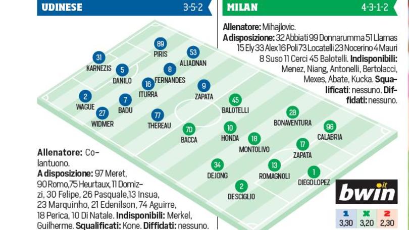 MILAN (3-5-2): Diego Lopez, Calabria, Zapata, Romagnoli, De Sciglio, Montolivo, De Jong, Bonaventura, Honda, Balotelli, Bacca. A disposizione: Abbiati, Donnarumma, Ely, Alex, Llamas, Poli, J.Mauri, Locatelli, Nocerino, Suso, Cerci, Luiz Adriano. Allenatore: Mihajlovic.