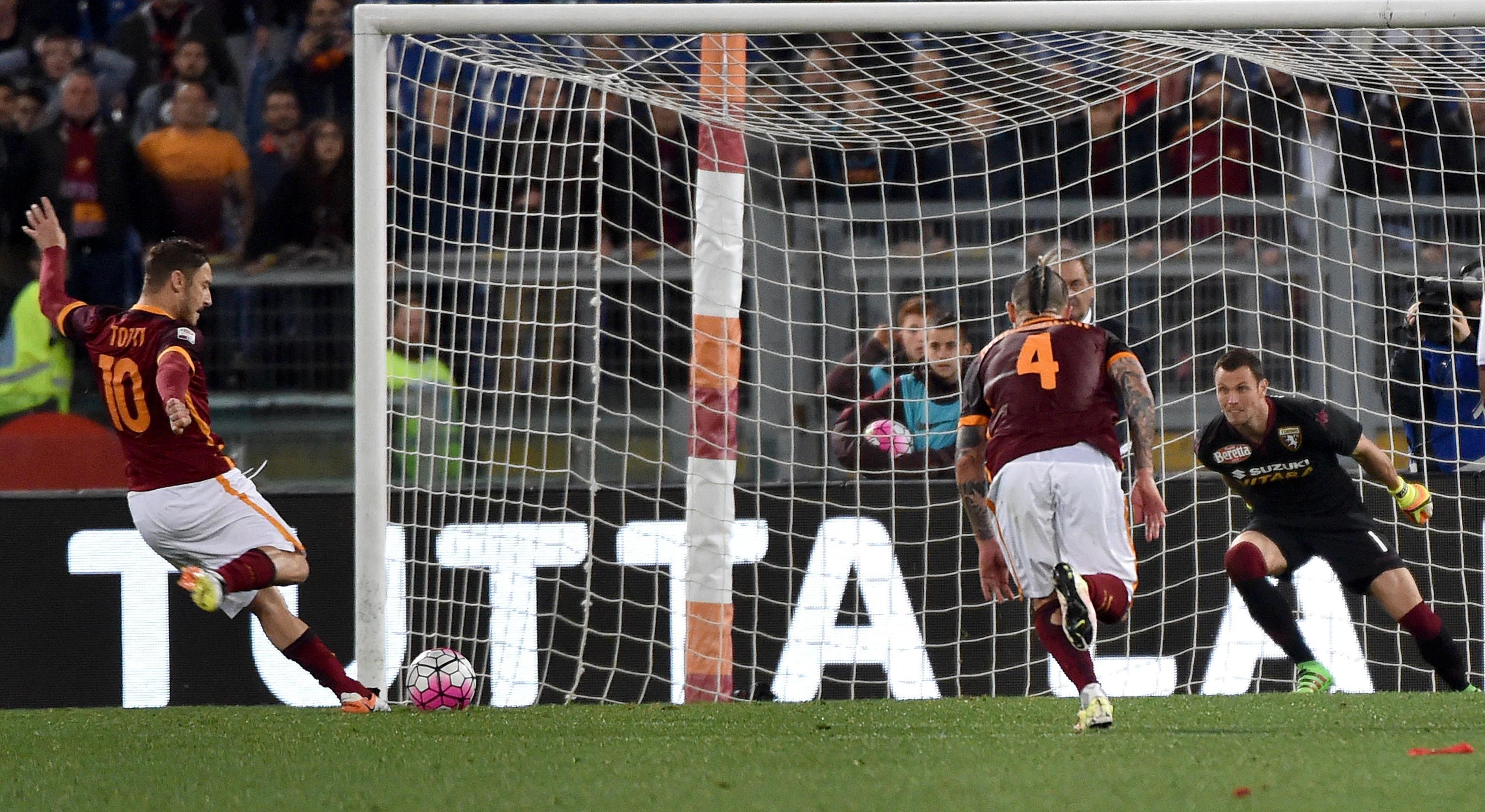 Tanti i suoi record: è il calciatore più anziano ad aver segnato in Champions League, in CSKA Mosca-Roma del 25 novembre 2014, a 38 anni e 59 giorni. In Serie A è il calciatore in attività con il maggior numero di presenze (605) e di gol segnati (250). Gol che ha segnato tutti con lo stesso club, anche questo un record. Totti è quello che ha realizzato più doppiette in serie A (46) e più calci di rigore (71). È quello che ha realizzato almeno un gol nel maggior numero di stagioni totali e consecutive (23). È l’unico calciatore nella storia del campionato italiano ad essere andato in doppia cifra con la stessa maglia per nove campionati consecutivi, l’unico in doppia cifra con la stessa maglia in dodici campionati totali. Totti è anche il calciatore più anziano ad aver realizzato una doppietta ed è il giocatore con il maggior numero di stagioni disputate in Serie A: 25 (tutte consecutive e con la stessa squadra) a pari merito con Paolo Maldini.