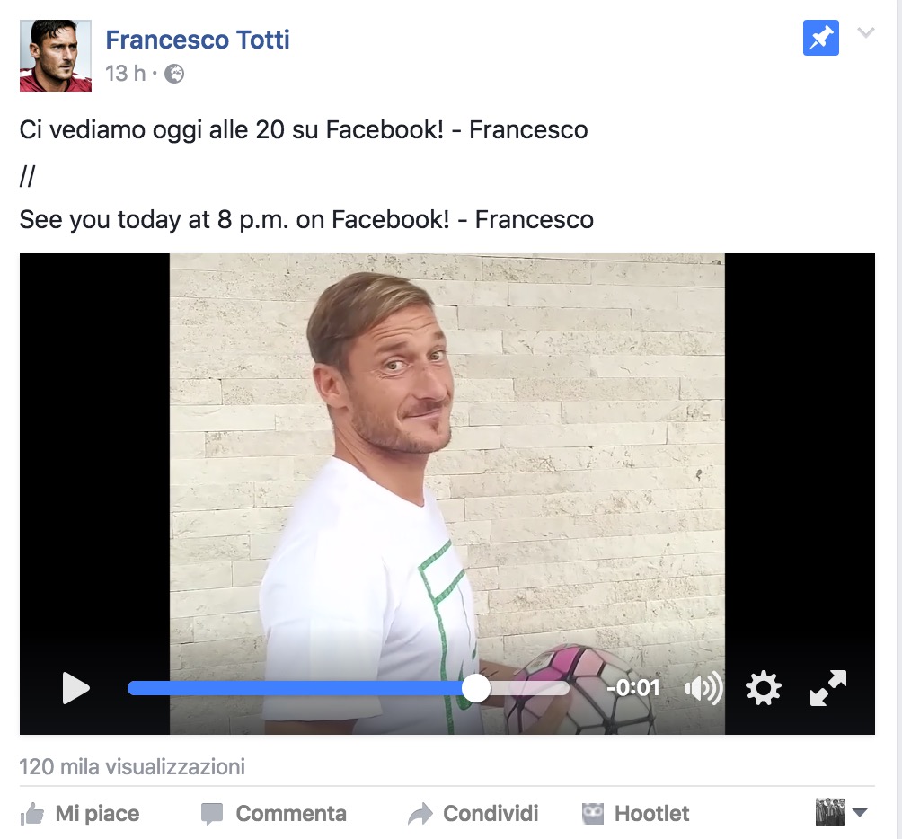 Sulla pagina facebook di Totti si possono vedere i video-auguri di Leo Messi, Usain Bolt, Nani, Andrea Pirlo, Fabio Cannavaro, Rafa Nadal, Alessandro Gassmann, Claudio Baglioni, Carlo Verdone, Fiorello, Carlton Myers, Barbara Pedrotti, Federica Pellegrini, Filippo Magnini, Teo Mammuccari…
