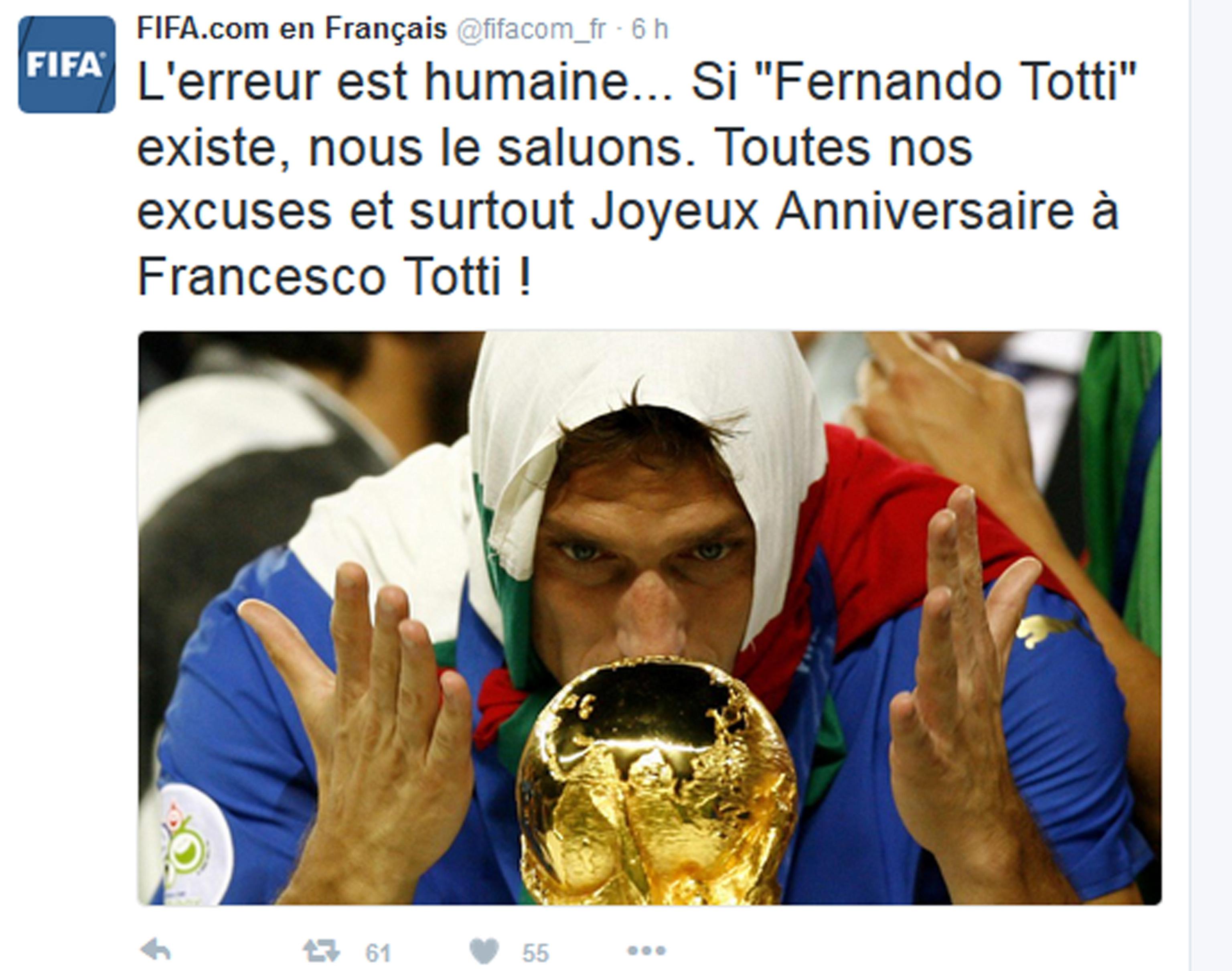 “Buon compleanno Fernando Totti”: gaffe del twitter della Fifa (foto Ansa)