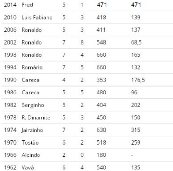 Nella tabella troviamo l’anno del Mondiale, il nome del giocatore, le partite disputate, le reti segnate, i minuti totali e i minuti impiegati per trovare ogni rete.