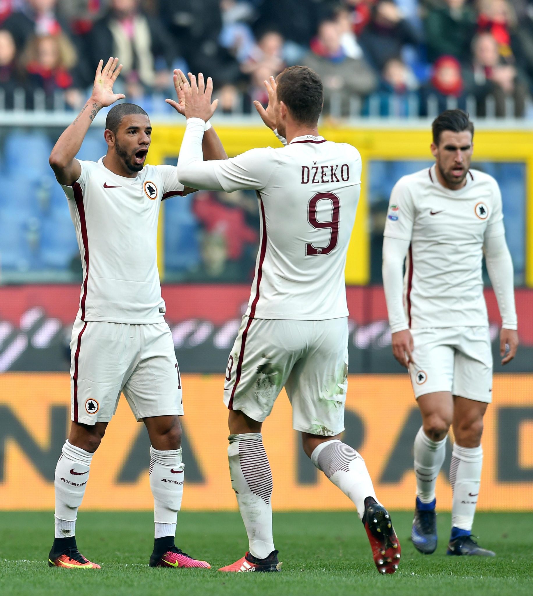 Roma (3-4-2-1): Szczesny 7.5, Rudiger 6, Fazio 6, Jesus 6, Peres 6.5 (40′ st Manolas sv), Strootman 6, De Rossi 6, Emerson 6, Nainggolan 6.5(43′ st Paredes sv), Perotti 6 (33′ st El Shaarawy 5.5), Dzeko 6.5 (18 Lobont, 19 Alisson, 5 Paredes, 10 Totti, 17 Seck, 21 Rui, 30 Gerson, 93 Tumminello) All. Spalletti 6.5.
