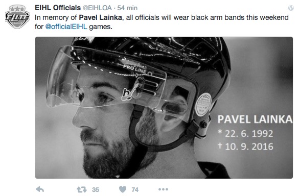”Dopo un grave trauma cranico ci ha lasciato il nostro amico e collega Pavel Lainka. Condoglianze alla famiglia. Riposa in pace”, ha scritto Nowotny. Il fatto risale al 25 agosto, nel corso della gara juniores tra le squadre di Brno e Šumperk. Dopo una conclusione in porta, il disco ha colpito alla testa il 24enne giudice di gara che si è accasciato per poi ricevere subito i soccorsi ed essere ricoverato in ospedale. Lainka è morto lo scorso weekend (10 settembre), dopo aver trascorso in ospedale due settimane in terapia intensiva.