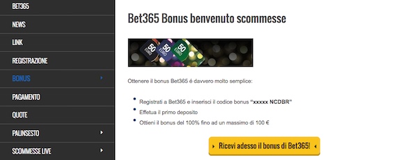 Mentre si segue in diretta la partita è poi possibile ad esempio scommettere sulla squadra che batterà il prossimo calcio d’angolo o che realizzerà il prossimo gol. Puntare in diretta aumenta sicuramente l’adrenalina e la passione nel seguire l’evento. Un altro punto a favore di questo bookmaker sono sicuramente le promozioni e in particolar modo il bet365 bonus di benvenuto, che è stato recentemente raddoppiato passando da 50 euro a 100 euro. Vi consigliamo di visitare la scheda del bonus bet365 per i nuovi clienti su 365scommessesportive.com per avere maggiori informazioni a riguardo. Le promozioni di bet365 non si limitano certo ai nuovi clienti e dopo la registrazione è sempre possibile ricevere offerte per scommettere sul calcio, sul basket e su altri sport.