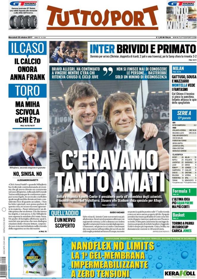 Spazio al litigio fra il presidente della Juventus, Andrea Agnelli, e il tecnico del Chelsea, Antonio Conte, su Corriere dello Sport. Durante il suo intervento nell’assemblea dei soci, il presidente bianconero ha parlato di Massimiliano Allegri, confermando la fiducia della società e spiegando che ha portato avanti un lavoro che ad altri sembrava terminato. Non si è fatta attendere la replica di Conte, che ha allento la Juve dal 2011 al 2014, proprio prima dell’arriva di Allegri. “Non si finisce mai di conoscere le persone. A volte servirebbe un minimo di riconoscenza e gratitudine”.