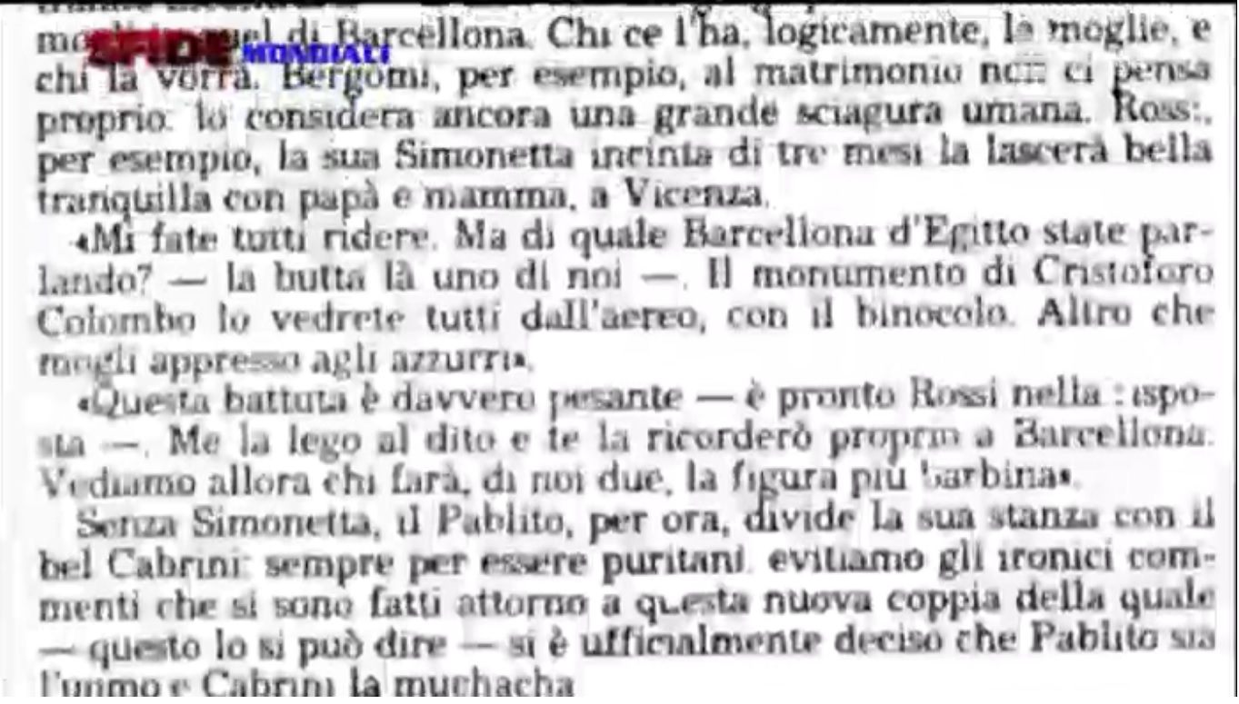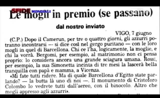 Il gossip su Rossi e Cabrini. Il culmine del conflitto fra la Nazionale e la stampa è un articolo pubblicato da Claudio Pea, inviato del Giorno. Articolo scherzoso su un Rossi che, in assenza della moglie Simonetta (incinta), rimediava con la “muchacha” Cabrini, suo compagno di stanza. Pezzetto di 12 righe che i diretti interessati presero con ironia, ma che gli altri giornali rilanciarono come l’allusione a una storia omosessuale fra i due calciatori. È la goccia che fa traboccare il vaso: il gruppo si chiude, da quel momento solo Zoff e Bearzot parleranno (poco) con i giornalisti. Pea la racconta così:
