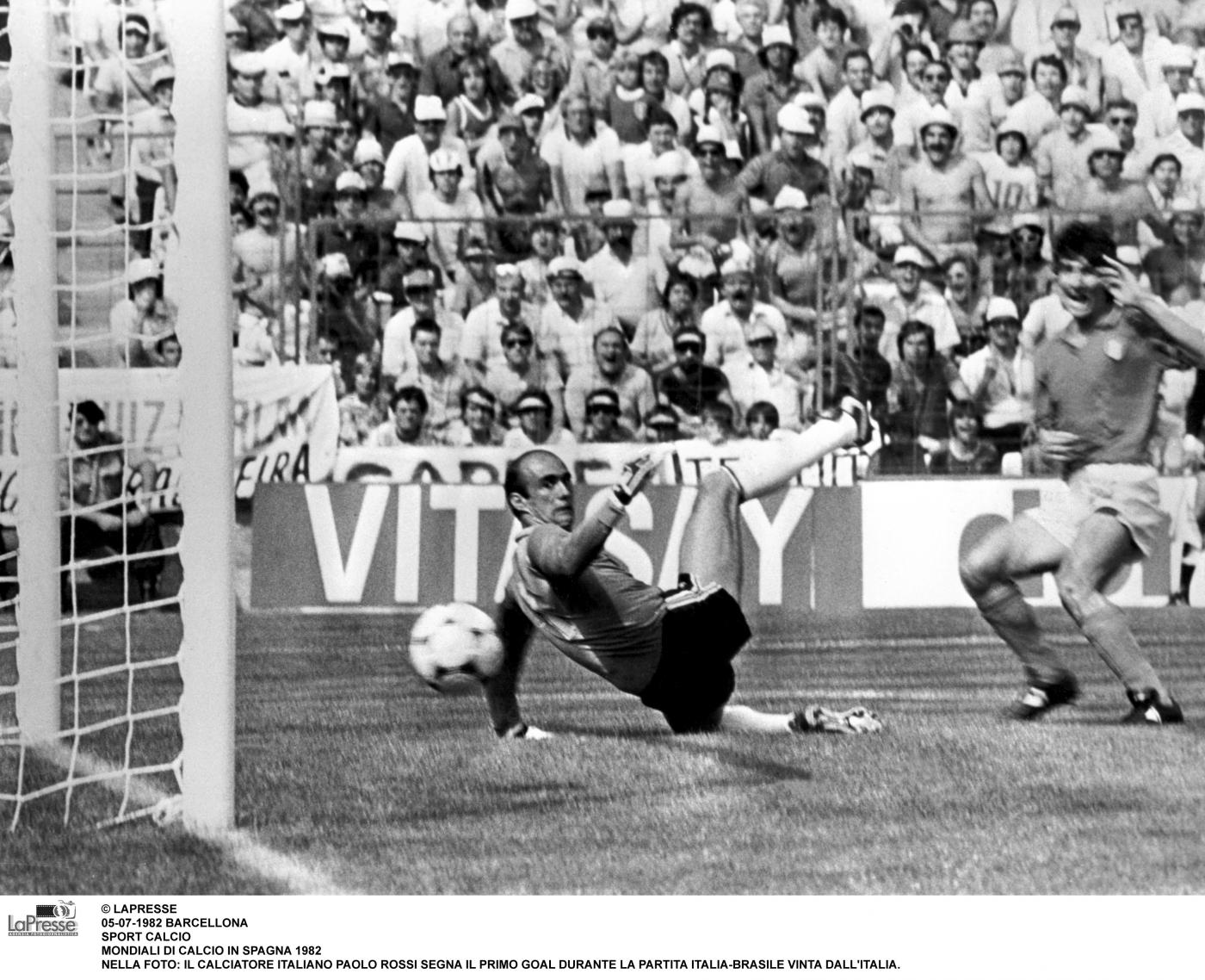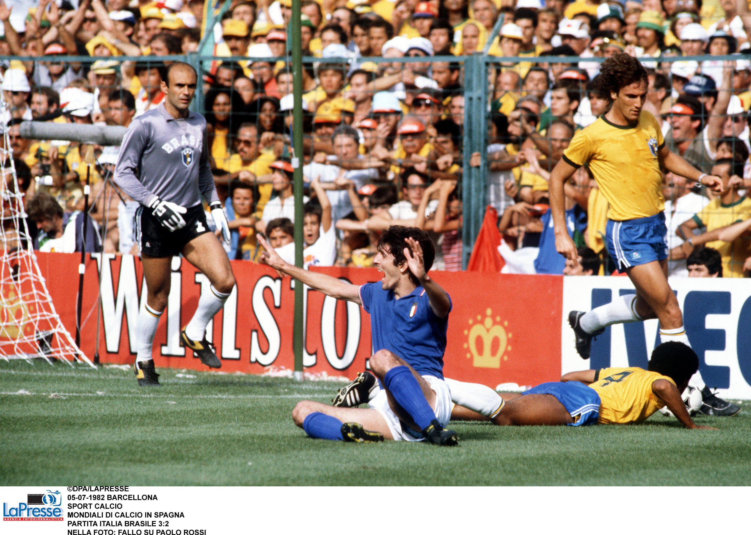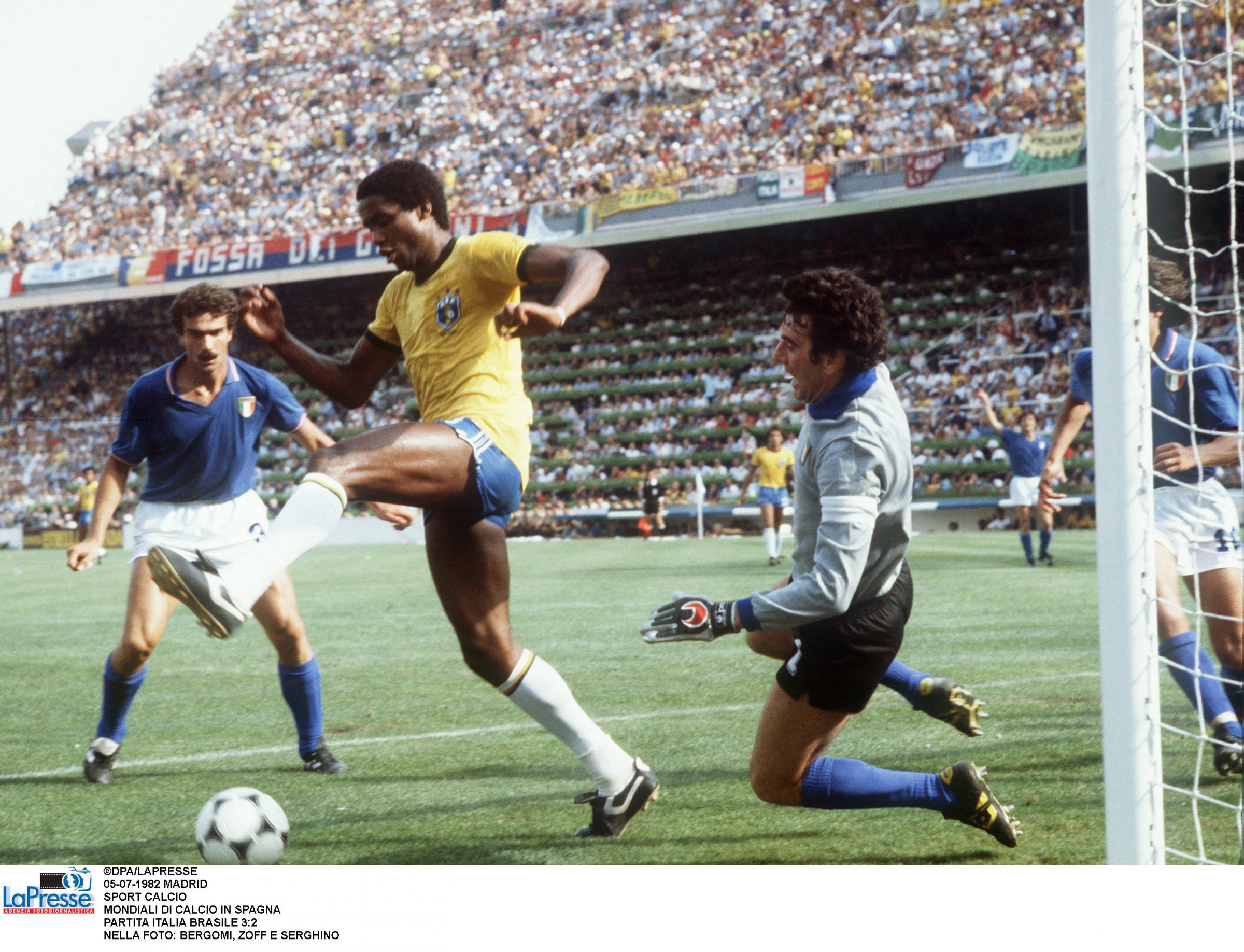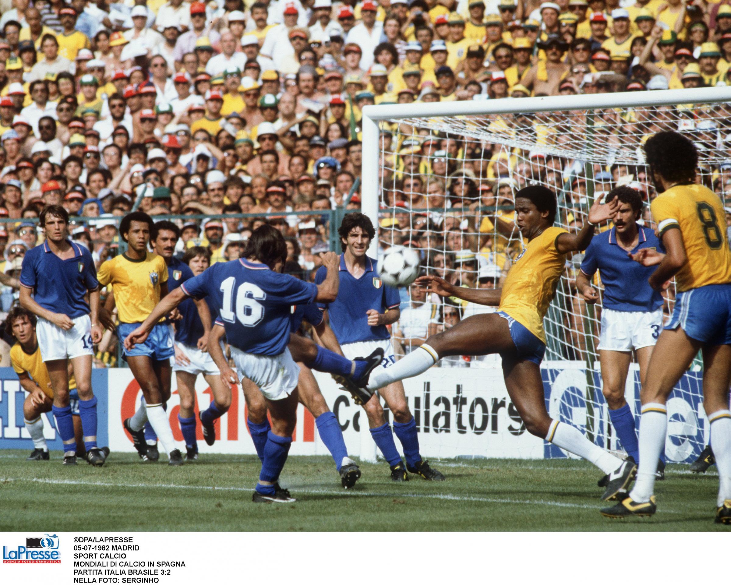 Sette giorni dopo incontriamo il favoritissimo Brasile, che a sua volta ha piallato per 3-1 l’Argentina. La differenza reti favorevole consente ai brasiliani di qualificarsi alle semifinali anche con un pareggio. L’Italia deve vincere, e sembra un’impresa, contro una delle Seleção più forti di sempre: i verde oro, allenati da Telè Santana, schierano Peres, Leandro, Oscar, Luizinho, Cerezo, Junior, Socrates, Serginho, Zico, Eder e Falcao. Bearzot risponde con Cabrini-Collovati-Gentile e Scirea davanti a Zoff; centrocampo a 4 con Antognoni, Oriali, Tardelli e Conti. Davanti Rossi e Graziani. È la partita del risveglio di Rossi, che ci porta in vantaggio dopo 5 minuti con un preciso colpo di testa su cross di Cabrini. Ma al 12′ Socrates porta palla fino al vertice dell’area piccola, dove inganna Zoff tirando sul primo palo invece di passarla al centro: 1-1. I brasiliani sembrano avere la partita in pugno, ma è un eccesso di sicurezza che al 25′ fa sbagliare un passaggio a Junior: Rossi ruba la palla e esplode un destro da fuori area: 2-1. Finiamo il primo tempo in vantaggio e con il giovanissimo Bergomi spedito nella mischia al posto di Collovati, infortunato. Nella ripresa, l’assalto dei sudamericani trova una muraglia in Zoff. Per pareggiare ci vuole un sinistro potente di Falcao, con una leggera deviazione di Bergomi. È il 69′. I brasiliani possono difendere il 2-2, ma è un misto di arroganza e generosità che li porta a continuare ad attaccare. Vengono puniti al 79′. Calcio d’angolo di Conti, Serginho ed Eder si disturbano colpendo insieme di testa, la palla arriva a Tardelli che tira al volo, sulla traiettoria c’è Rossi, che spiazza Peres: 3-2. L’arbitro poi annulla ad Antognoni il gol del 4-2, che era regolare. A un minuto dalla fine, tuttavia, i brasiliani arrivano vicinissimi al pari: ma il colpo di testa di Eder viene bloccato da Zoff sulla linea. Collovati: “Prima della partita i brasiliani cantavano nel loro pulmann, nel nostro c’era solo silenzio e tensione. All’uscita li affiancammo. Vidi che Falcao e Zico piangevano, mentre nel nostro pulmann facevamo festa”.