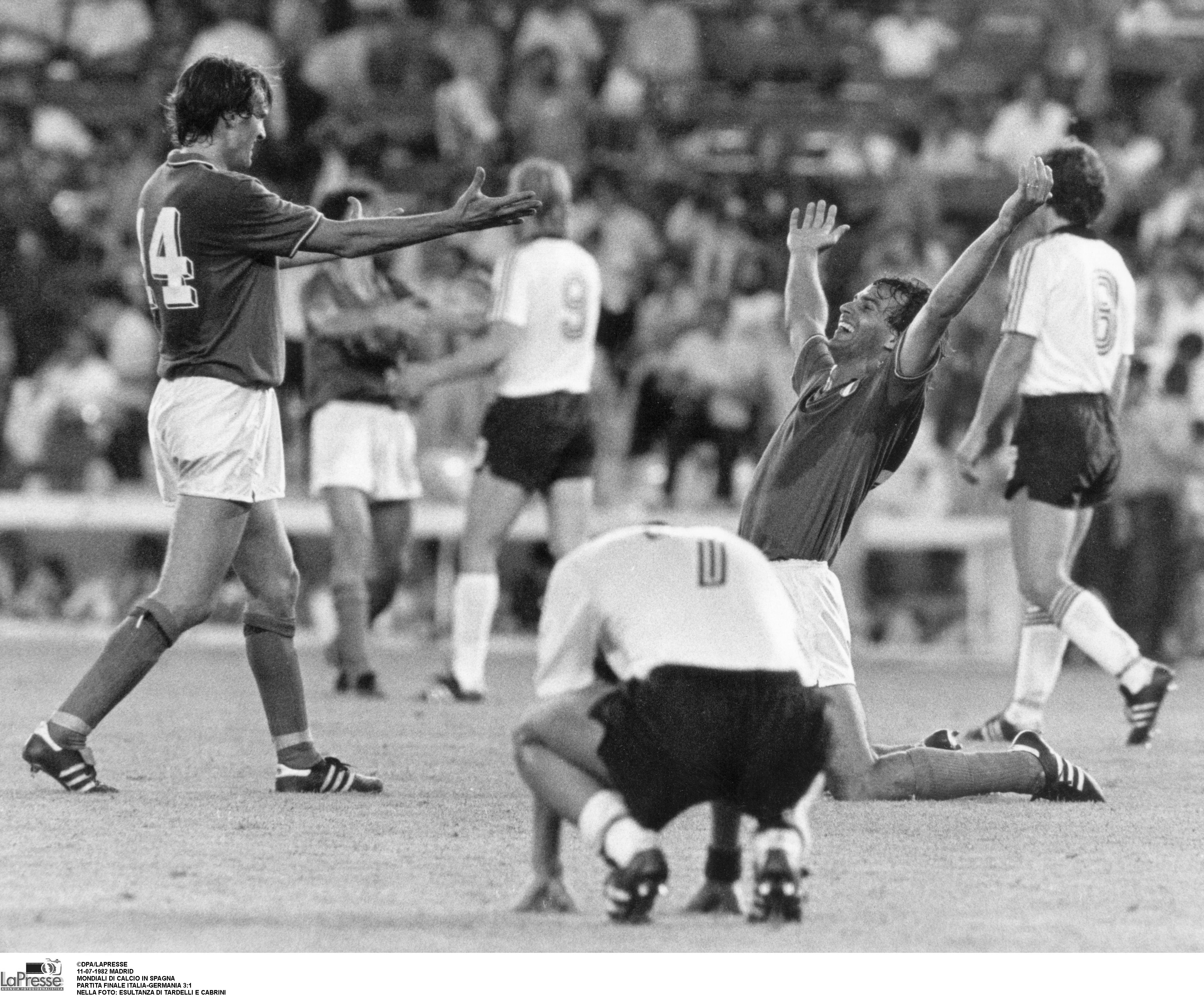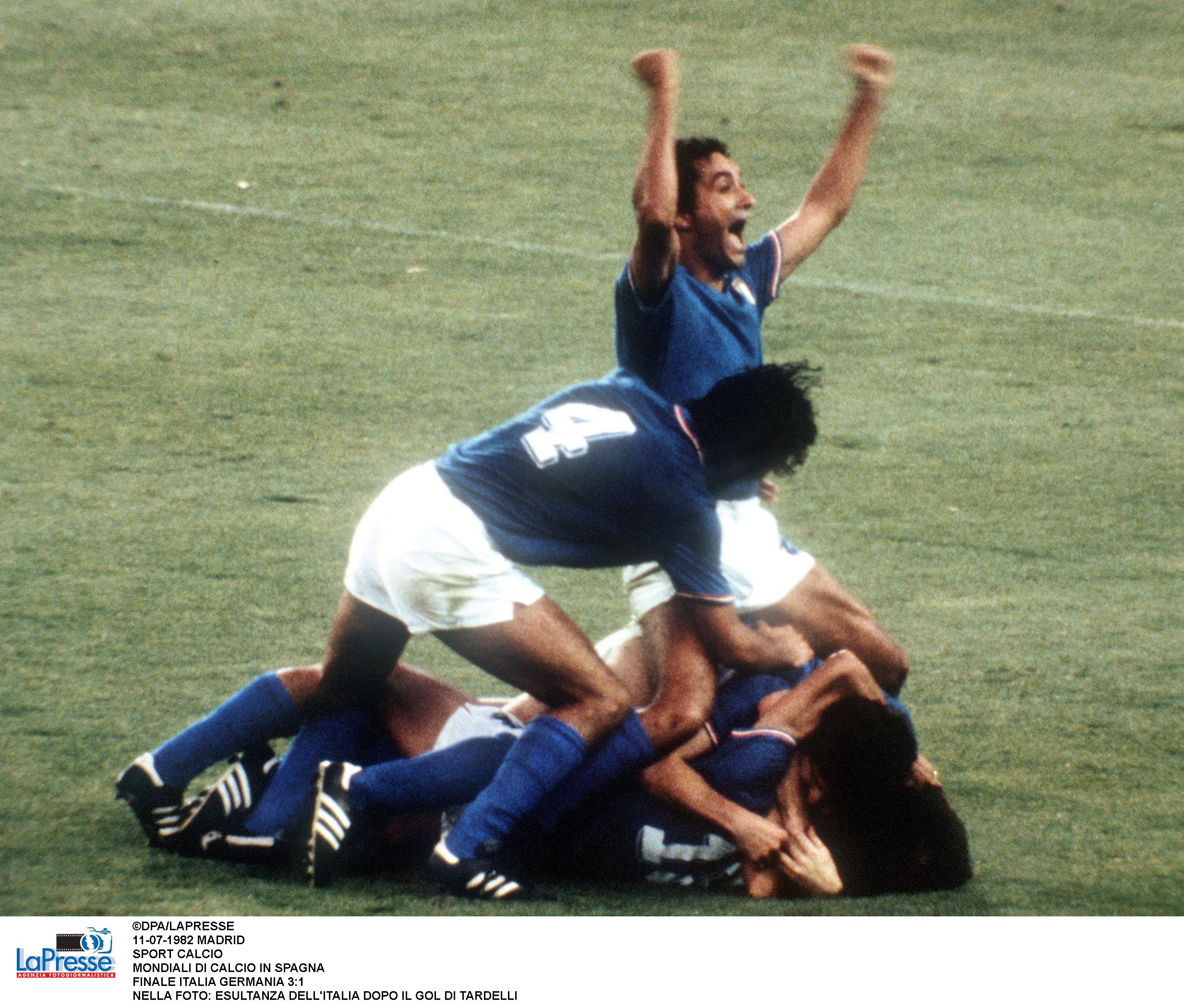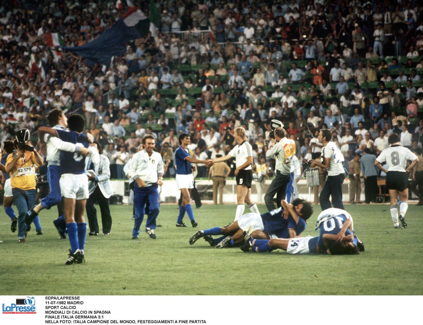Il 12 luglio quindi il Santiago Bernabeu tifa Italia. Gli azzurri sfruttano il “fattore campo” ma soprattutto la loro superiore condizione fisica. Potrebbero passare in vantaggio già nel primo tempo sul calcio di rigore, ma Antonio Cabrini la spara fuori. Invece di abbattersi, gli undici di Bearzot ritornano in campo con rabbia. Una rabbia che porta Cabrini e Rossi ad avventarsi come disperati su un cross di Gentile. La spunta Rossi, che ci porta in vantaggio. È il 56′. Dodici minuti più tardi Scirea serve al limite dell’area una palla che Tardelli stoppa male ma rimedia tirando in scivolata un memorabile diagonale. Il suo urlo è la liberazione di una nazionale che sta per vincere un mondiale dopo due mesi di polemiche e critiche. Non è finita, perché in contropiede Spillo Altobelli ha la freddezza di dribblare Schumacher e segnare il 3-0. All’83’ Breitner segna il gol della bandiera per i tedeschi. Poi il fischio finale e il triplice “Campioni del Mondo” ripetuto dal telecronista Nando Martellini.