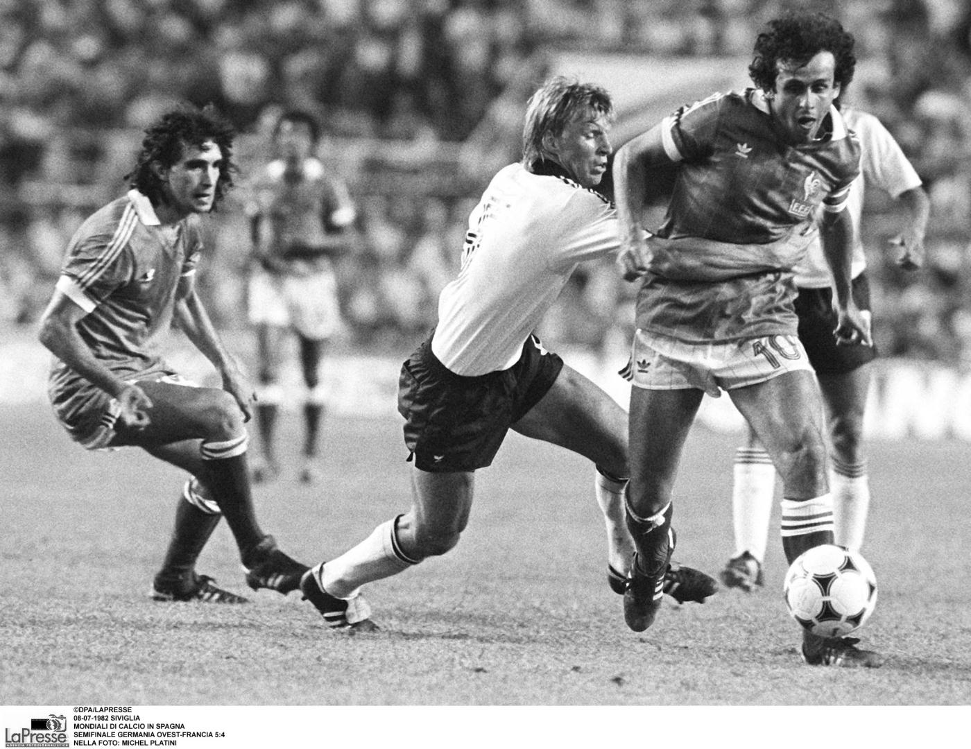 Francia-Germania 8-7. Finisce 1-1 dopo 90 minuti, con Platini che su rigore replica al vantaggio di Littbarski. Nel secondo tempo il portiere tedesco Schumacher con un folle intervento riduce in coma il francese Battiston, che sembra morto sul colpo: dopo alcuni giorni di coma ne uscirà con due denti rotti e due vertebre incrinate. Sarebbe, tra l’altro, calcio di rigore ed espulsione. Durante i soccorsi Schumacher, con strafottenza, si mette a fare stretching davanti ai tifosi francesi: L’Equipe lo chiamerà “mostro”. Nei supplementari Tresor (92′) e Giresse (98′) portano i galletti sul 3-1. Ma i tedeschi sono sempre i tedeschi: non mollano mai. Rummenigge (102′) e Fischer (108′) fanno 3-3. Quindi si va ai rigori: mai una partita dei mondiali era stata decisa dagli undici metri. Passano i tedeschi, che ne segnano 5 contro i 4 dei francesi.