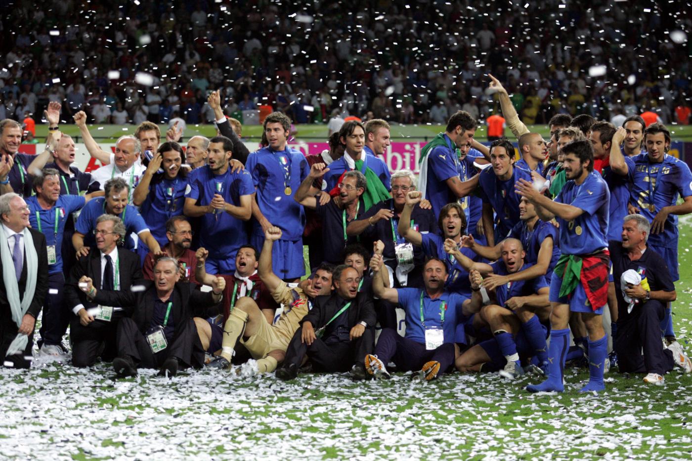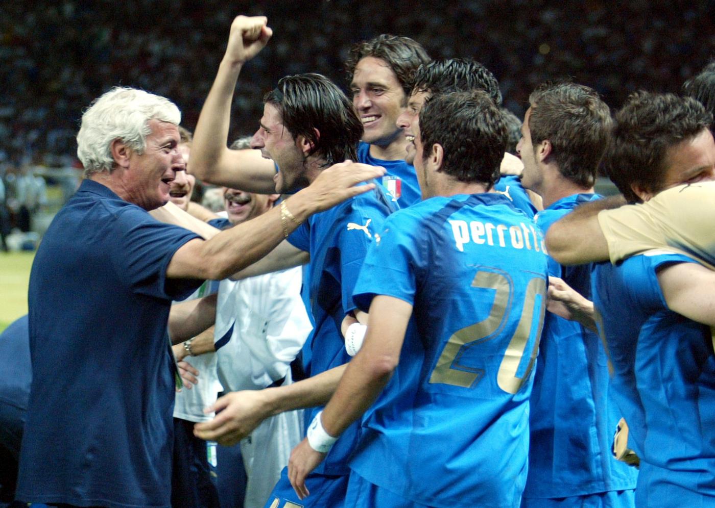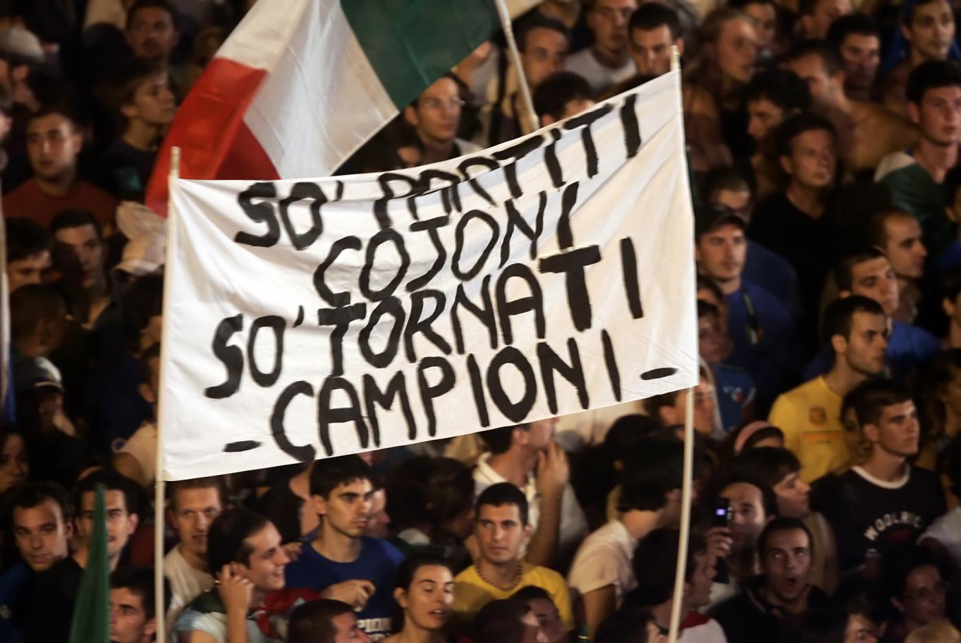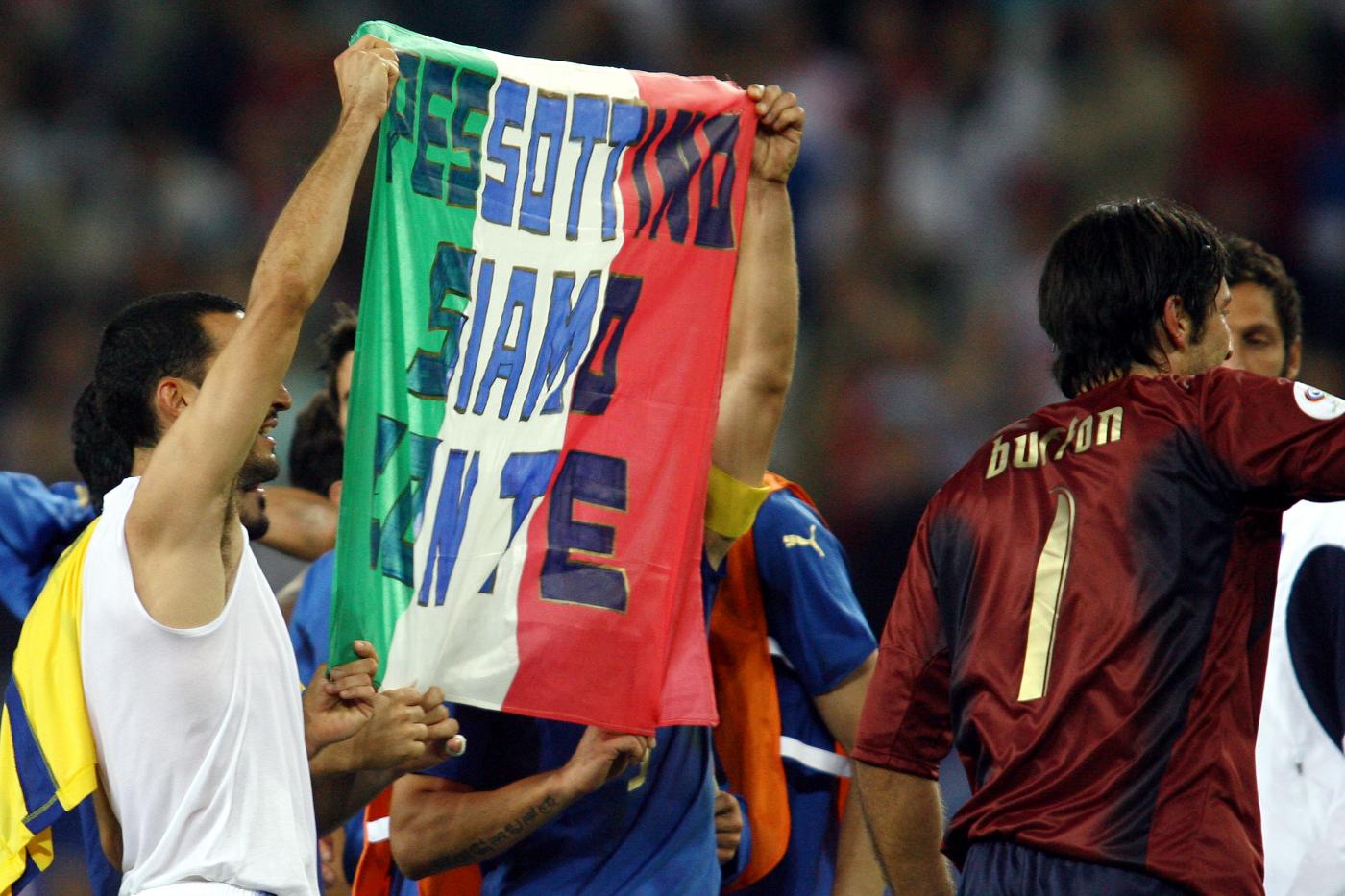 Il mondiale di Germania 2006 ha molti punti in comune con quello del 1982: le critiche all’allenatore e al gruppo, i pronostici sfavorevoli della vigilia, l’assenza di grandi solisti, la forza della difesa e del collettivo. La nazionale arriva al ritiro di Coverciano in pieno terremoto Calciopoli, che investe anche Lippi, Cannavaro e Buffon, tutti e tre legati a vario titolo alla Juve, la squadra più colpita dalle inchieste. Marcello Lippi, oltre che allenatore simbolo dei bianconeri, è padre di Davide Lippi, procuratore coinvolto nell’indagine sulla Gea World. Fabio Cannavaro è uno degli juventini più rappresentativi (giocò 48 delle 51 gare ufficiali di quella stagione) e viene attaccato perché in conferenza stampa difende Luciano Moggi, l’imputato degli imputati di Calciopoli. Gigi Buffon, portiere della Juve è coinvolto in un’inchiesta secondaria, quella sul calcioscommesse a Parma. Il 25 maggio lascia il ritiro scortato da Gigi Riva per essere interrogato dai pm parmigiani. In quei giorni si pensa che, come è successo per i vertici della Federcalcio, Buffon Cannavaro e Lippi debbano andare a casa. Buffon e Cannavaro giocheranno, da assoluti protagonisti, tutti i 690 minuti di quel mondiale. Lippi non sbaglierà una mossa. Uno striscione esposto al Circo Massimo sintetizza brutalmente: “So’ partiti cojoni so’ tornati campioni”.