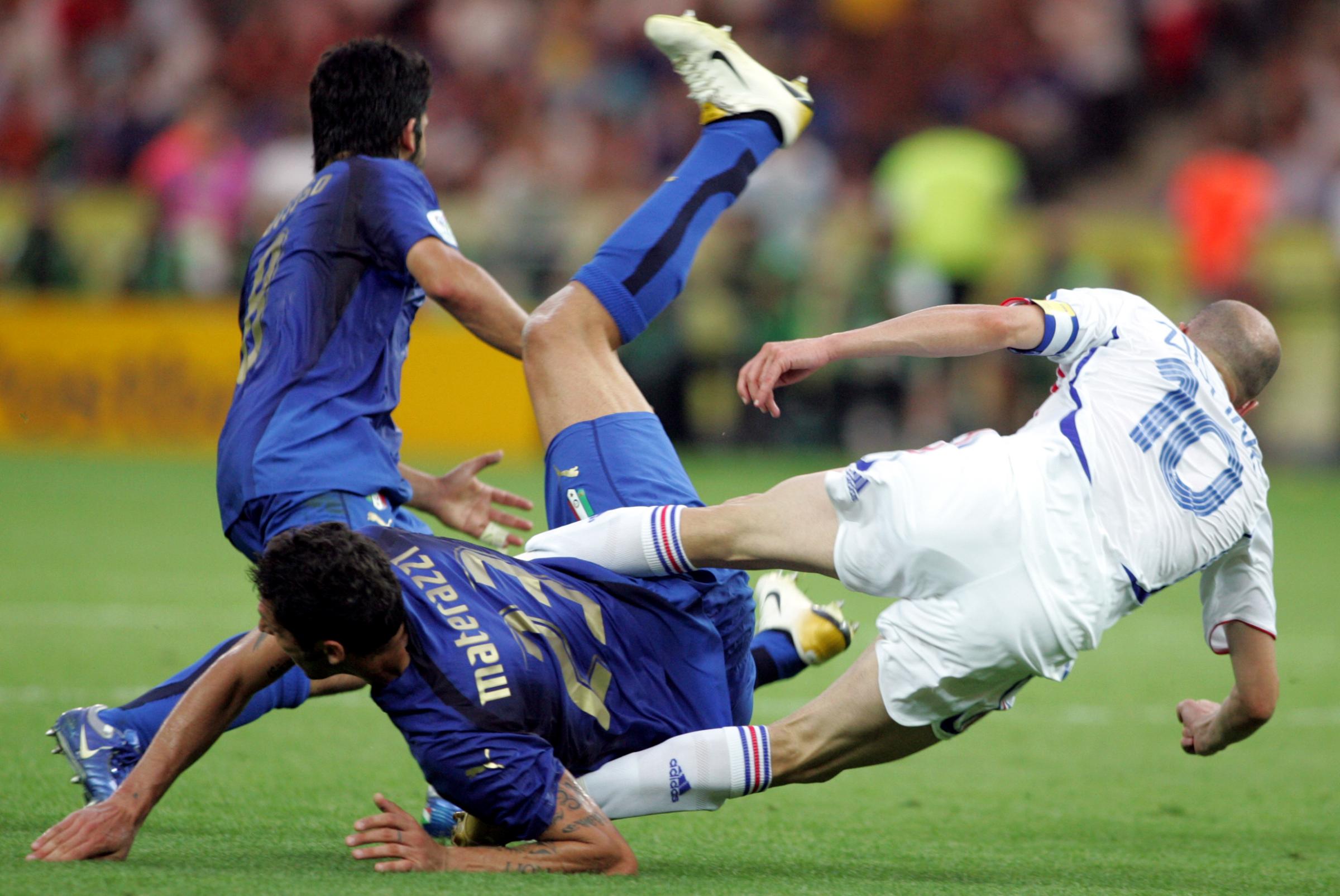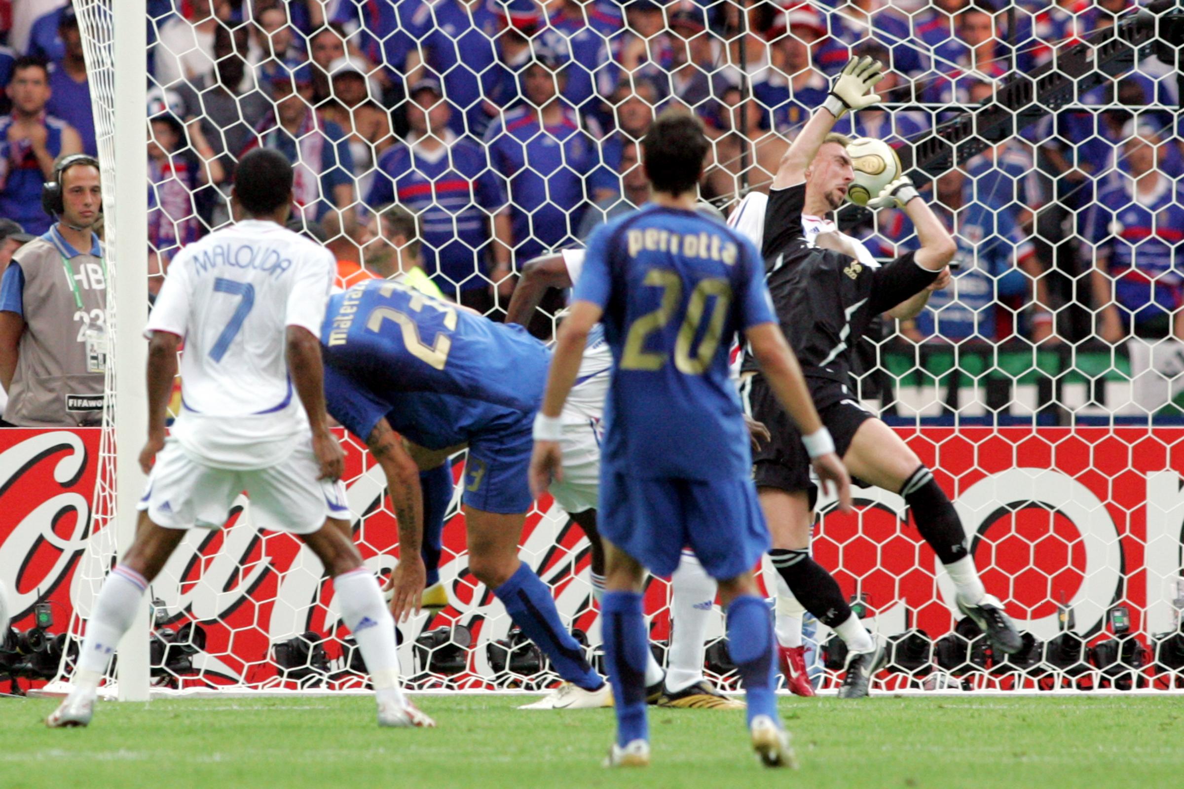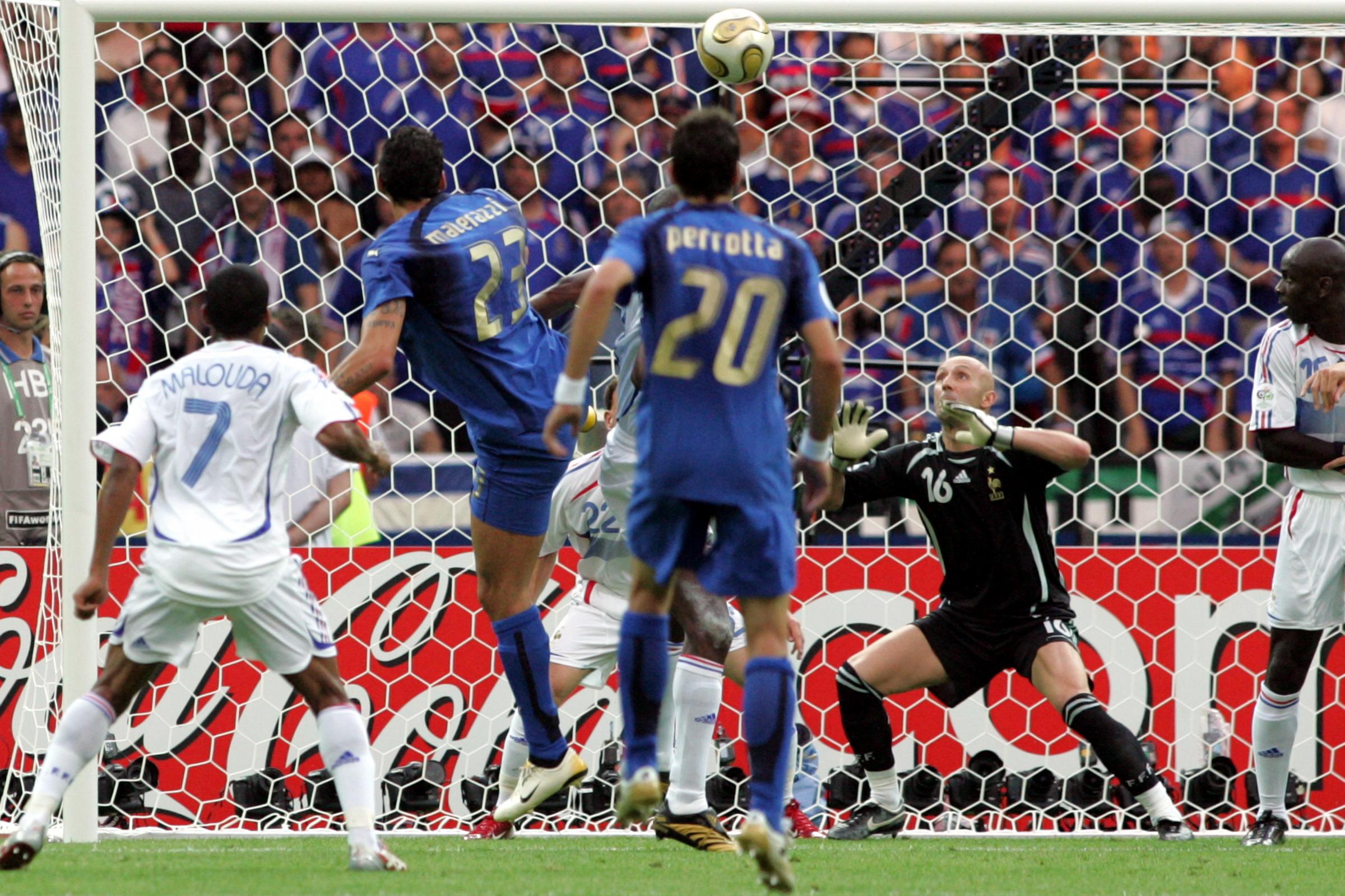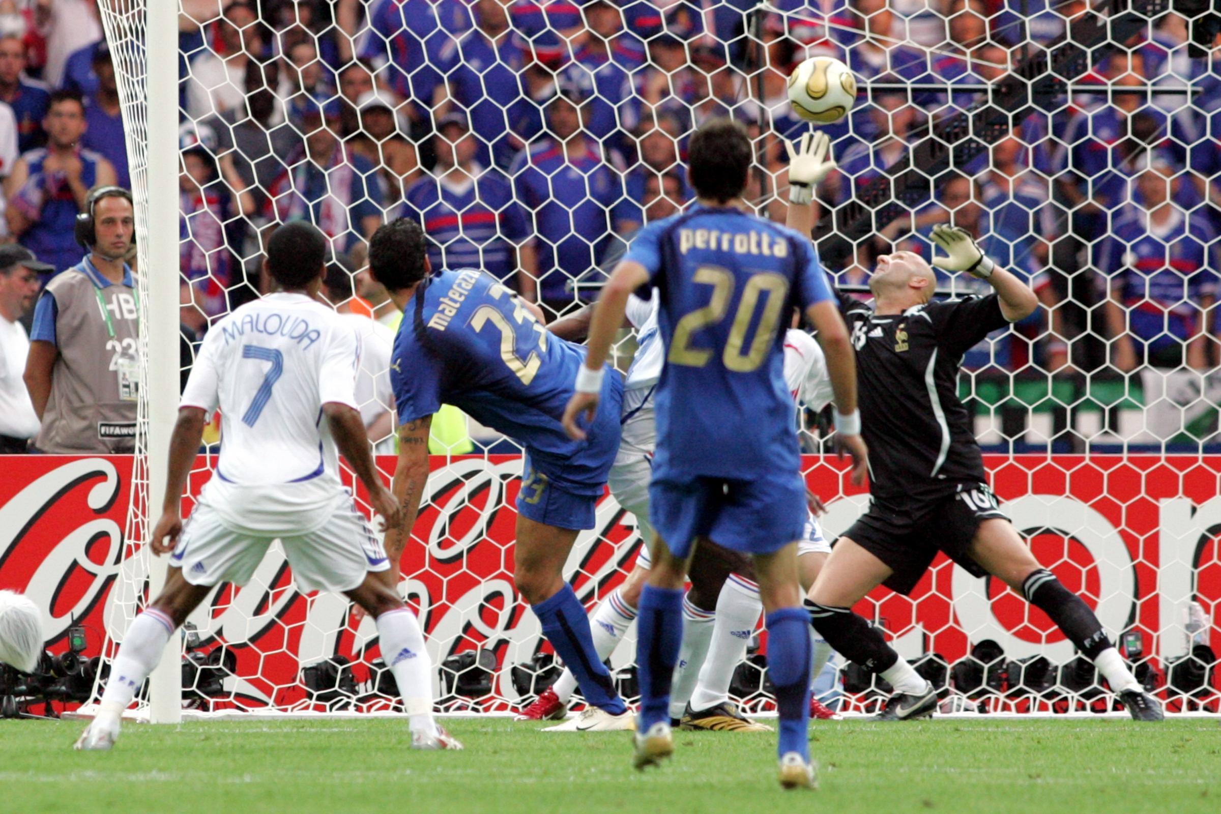 Protagonista in negativo e in positivo Materazzi. Dopo 7 minuti atterra Malouda: calcio di rigore che Zidane trasforma con uno sprezzante cucchiaio che colpisce la traversa e finisce dietro la linea di porta. Dopo 12 minuti Materazzi rimedia con un imperioso stacco di testa su corner di Totti. Ancora di testa con Materazzi (respinto sulla linea di porta) e Toni (traversa) sfioriamo il vantaggio. Poi è dominio francese e buona difesa italiana, che non concede molto ai galletti. Si va ai supplementari e i francesi continuano ad attaccare, sfiorando il gol con Ribery e una grande parata di Buffon su testa di Zidane. Proprio Zidane, il migliore dei suoi, cambia l’inerzia della gara facendosi espellere al minuto 111 per una testata al petto di Materazzi, che gli aveva rivolto una frase che per mesi si tenterà di decifrare. Mistero svelato un anno dopo: Zidane si lamenta della marcatura stretta chiedendo all’italiano se voleva la sua maglia. Materazzi risponde: “Preferisco la puttana di tua sorella”.