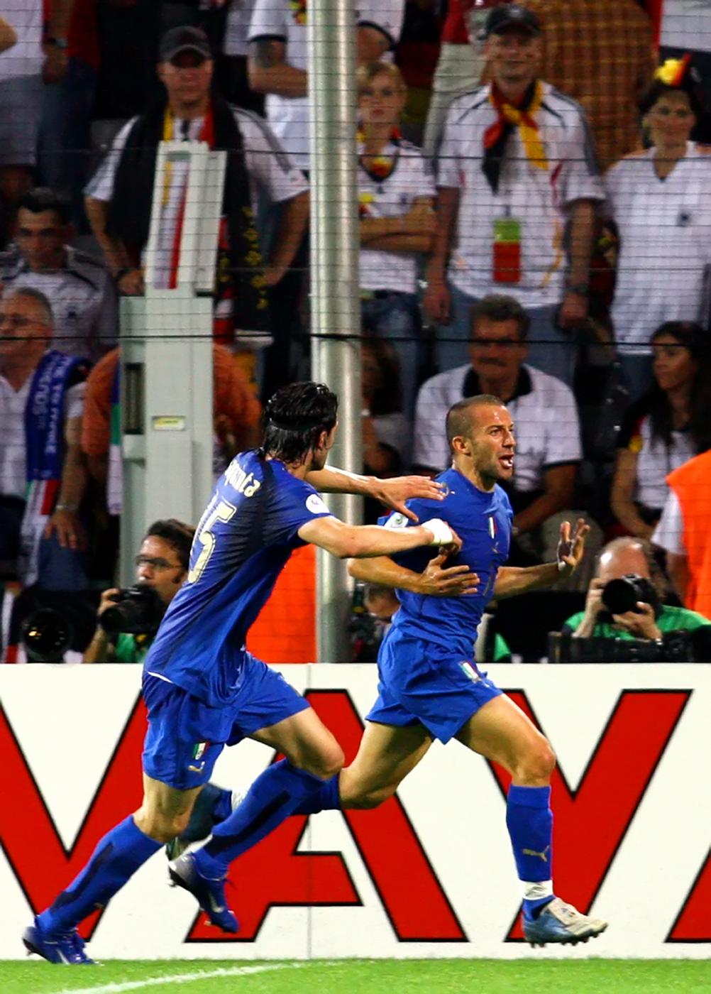 Si arriva il 4 luglio in semifinale con la Germania, in una gara molto sentita dagli immigrati italiani e dai giornali tedeschi, che fomentano un sentimento anti-italiano con titoli pieni dei soliti luoghi comuni. In campo a Dortmund, dove la Germania ha sempre vinto, gli undici allenati da Klinsmann hanno paura di una squadra che ai mondiali li ha sempre battuti. L’Italia gioca meglio ma dopo 90 minuti siamo sullo 0-0. Nei supplementari continuiamo a giocare meglio, ma il palo di Gilardino e la traversa di Zambrotta sembrano portarci ai maledetti rigori, finché Pirlo senza guardare serve Fabio Grosso che beffa Lehmann con un piatto sinistro a giro dal limite dell’area piccola. È il 119°. Due minuti dopo Cannavaro trasforma una palla rubata ai tedeschi in un contropiede in cui Totti lancia Gilardino che a sua volta serve di tacco Del Piero, che si è fatto 70 metri di corsa e da almeno 20 metri sta chiedendo palla al compagno: si esibisce in un interno a giro dei suoi, che finisce poco sotto l’incrocio. È 2-0, “andiamo a Berlino”. E siamo l’incubo dei tedeschi: nel 1970 li abbiamo eliminati in semifinale con un 4-3, nel 1982 battuti in finale 3-1, nel 2006 li abbiamo umiliati in casa nel mondiale che pensavano di vincere.