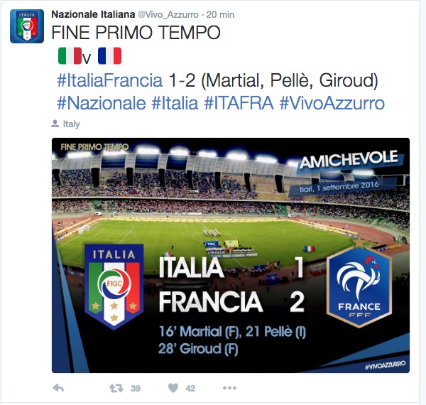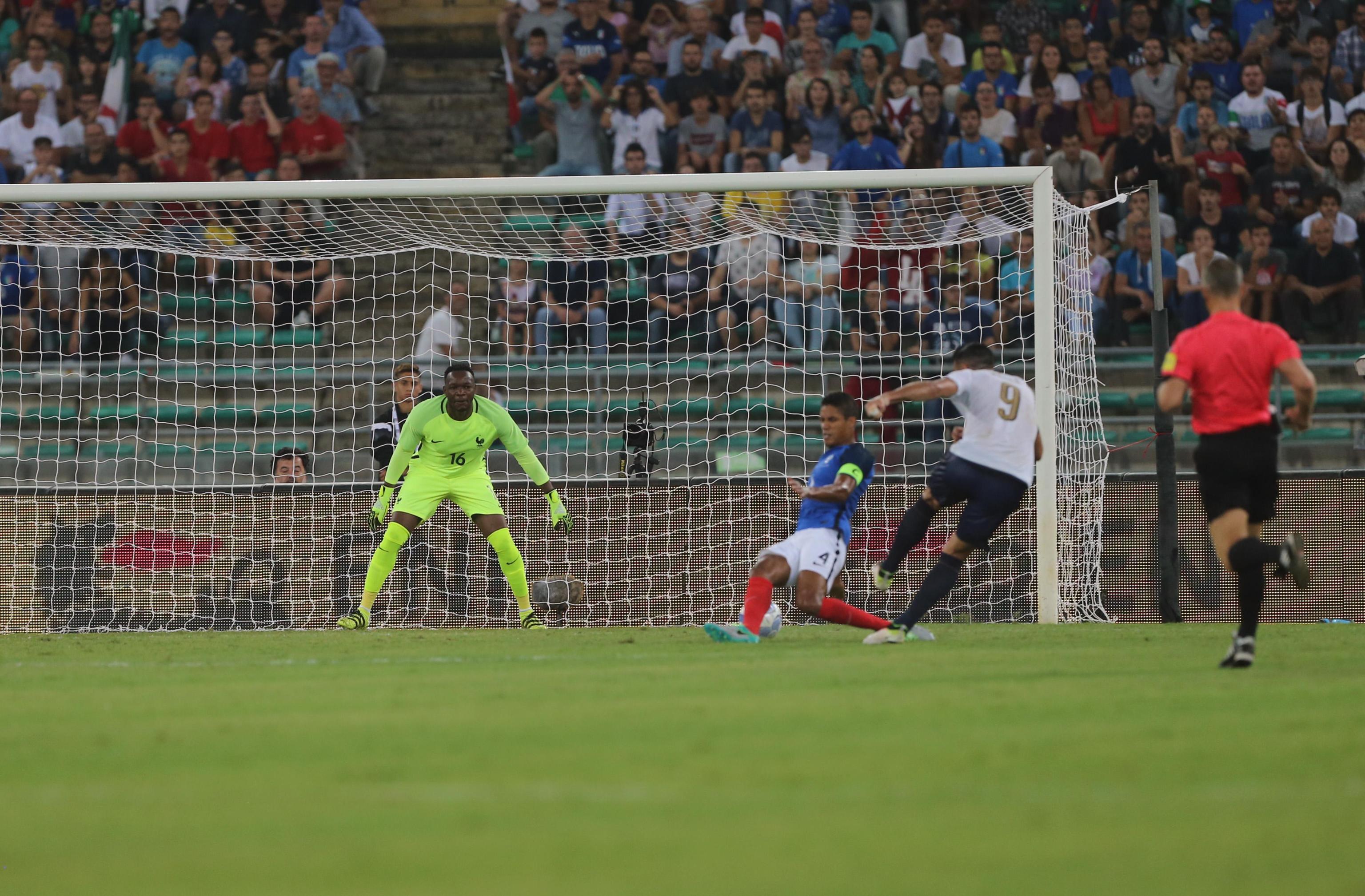 Kantè gioca dal primo minuto, avanti Martial è titolare. La partita la fa l’Italia, con intensità inattesa. Dal primo angolo di Candreva Pellè gira di destro di poco al lato, ed è solo il 2′. De Rossi ci prova di testa, il pallino è in mano agli azzurri, ma alla prima azione francese arriva il gol: il lancio di Pogba – fischiatissimo dagli juventini di Bari – è lisciato da Chiellini e Martial non perdona con un rasoterra preciso: 17′, è 0-1. L’Italia reagisce subito, dopo 4′ la combinazione Eder-Pellè porta al pari: da applausi stop e girata del centravanti, che dopo il rigore sbagliato all’Europeo sembrava aver perso il treno azzurro. Sembra invece ancora sbalestrato dal primo errore di stasera Chiellini: c’è lui ancora su Giroud al 28′, quando la spizzata di testa di Kurzawa diventa un assist su cui il difensore non chiude. Sinistro a incrociare del centravanti francese, ed è 1-2.